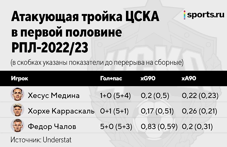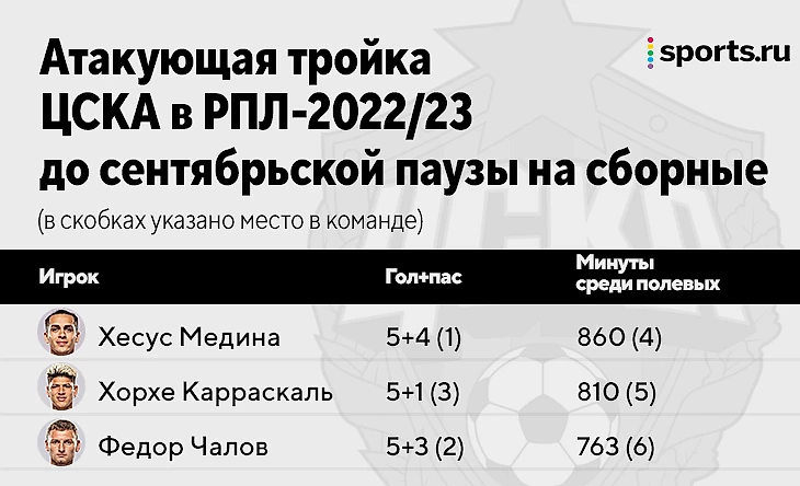 После сентябрьского перерыва на сборные Кучаев и Обляков успешно заменили Карраскаля и Медину. Тогда перемены связывали с перелетами в Колумбию и Парагвай, ноо уже в следующем туре с «Динамо» (1:1) ЦСКА использовал Карраскаля, Чалова и Кучаева – Федотов списал отсутствие Медины на конкуренцию.