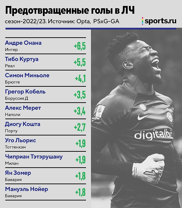 После неудачного матча Хандановича против «Ромы» Онана выиграл конкуренцию и в Серии А. Но главные чудеса творил в Лиге чемпионов. Начнем с простого – Онана лидирует в списке лучших по количеству игр на ноль. Да, после «Золотой перчатки» Де Хеа в сезоне-2022/23 на подобные достижения стоит смотреть чуть пристальнее, но в случае Андре вклад в 8 сухих матчей реально значительный.