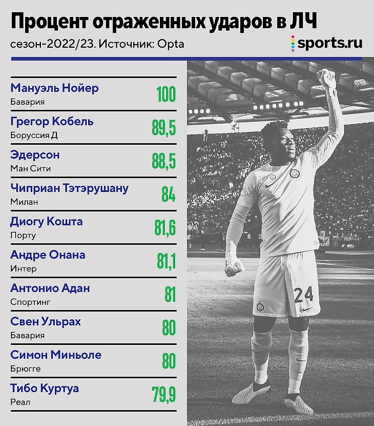 Теперь процент отраженных. Метрика мало говорит об уровне голкипера и сложности ударов, но сойдет как дополнительный штрих к ЛЧ-портрету Онана. Здесь Андре не первый – добрался до середины топ-10. Зато сохранил высокий процент на самой длинной дистанции – у Онаны 1080 минут в этом сезоне ЛЧ. Ни один другой футболист не сыграл больше.