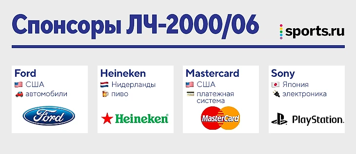 В новый век Лига чемпионов вошла с привычной четверкой спонсоров из 90-х. Этот набор не менялся в начале нулевых два трехлетних цикла.