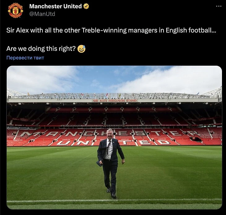 А вот пост на 50 тысяч лайков в клубном твиттере: «Сэр Алекс со всеми другими тренерами, завоевавшими треблы в английском футболе...».