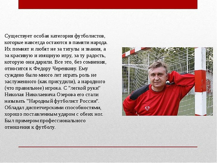 Фёдор Черенков по-настоящему великий спортсмен, но самое главное - истинное воплощение доброты, скромности и любви к людям. Он никогда не был супербомбардиром и так не сумел выступить со сборной на большом турнире, но он всегда дарил зрителям на стадионе и у экранов телевизоров подлинное чудо. Его любили абсолютно ВСЕ!