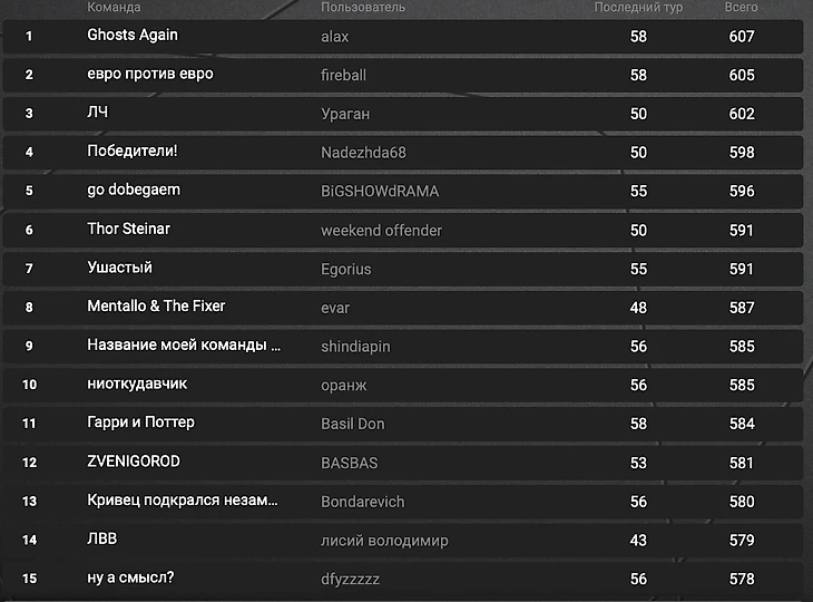 Первое место – alax (607 очков). Приз – Apple Watch, звезда и специальный памятный бейдж в профиле на Sports.ru;