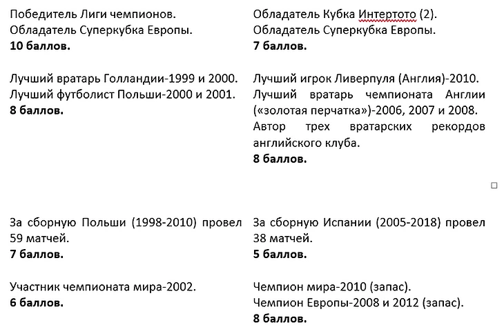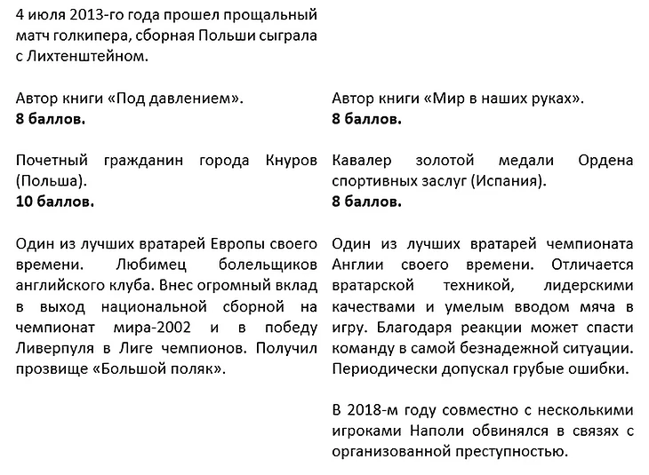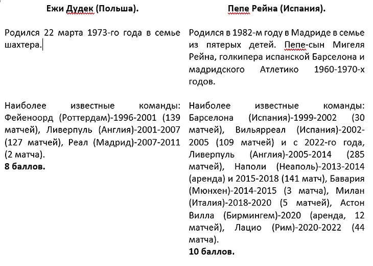 Клубная карьера: здесь польский вратарь уступил, так как его карьеру немного испортил период в мадридском Реала, где он практически не выступал. Рейна играл постоянно в Вильярреале, Ливерпуле, Наполи и Лацио, что дает ему некоторое преимущество.
