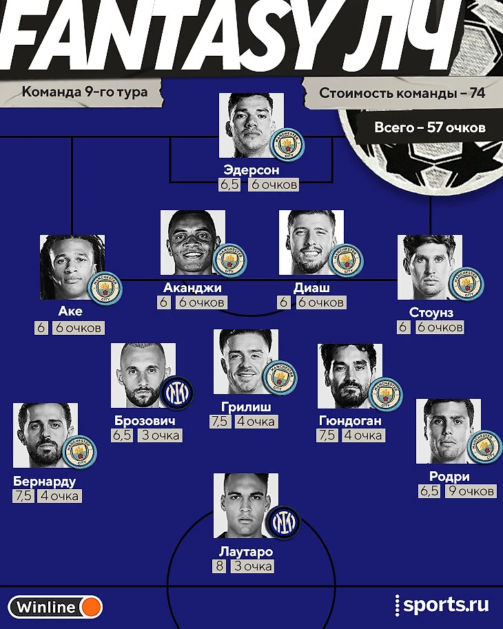 😍 Кто же мог быть тут лучшим, если не автор победного гола? Родри – единственный набрал больше шести очков. Сухая победа и гол – это девять. Не зря его признали лучшим игроком всей Лиги чемпионов. Признавайтесь, кто верил в испанца настолько, чтобы сделать еще и капитаном?
