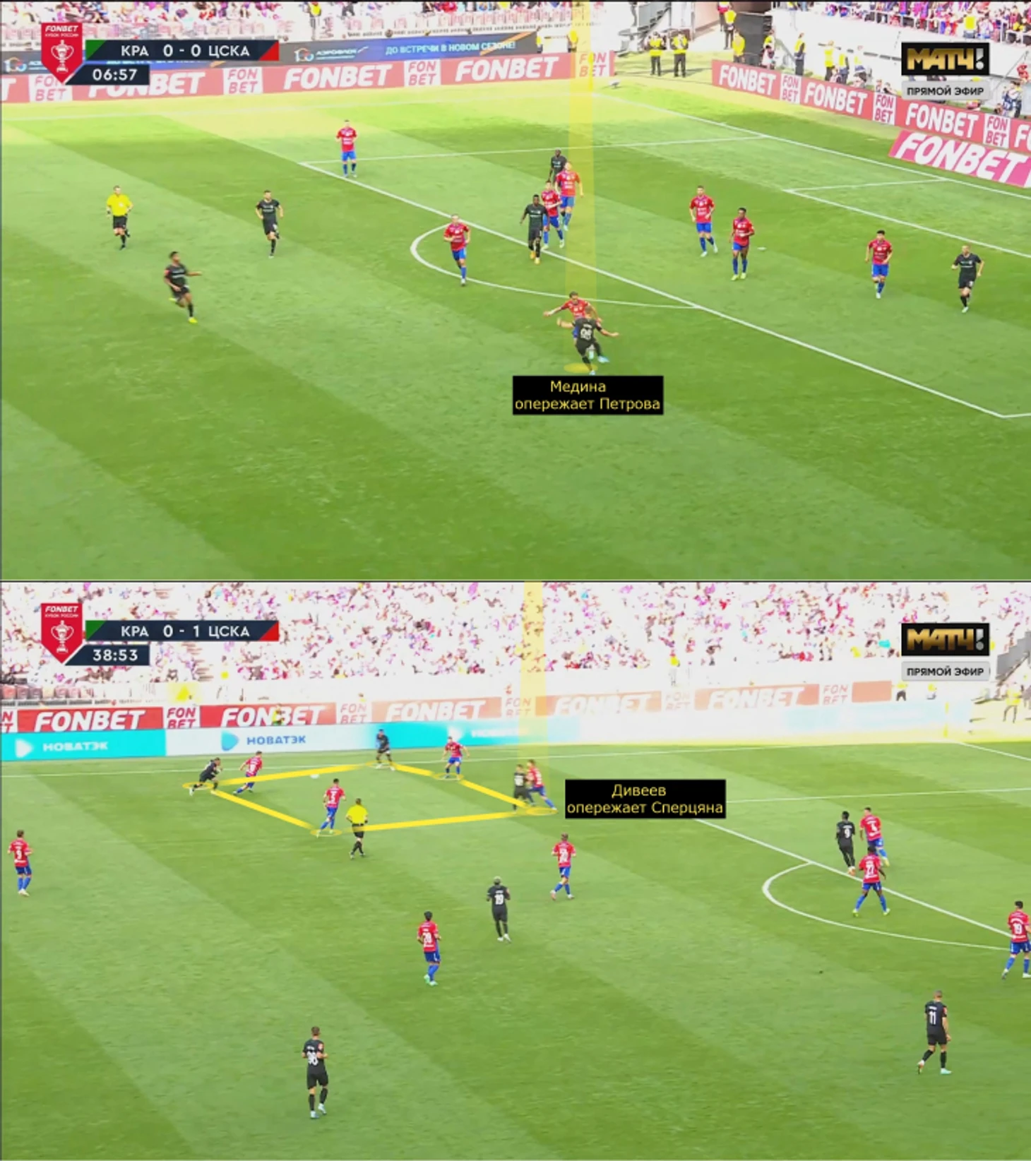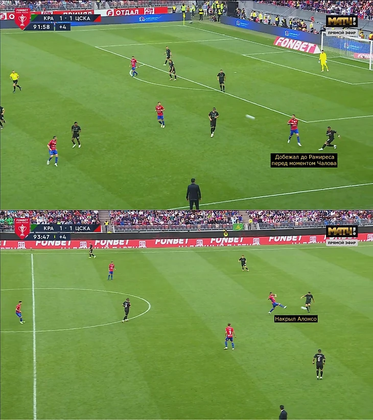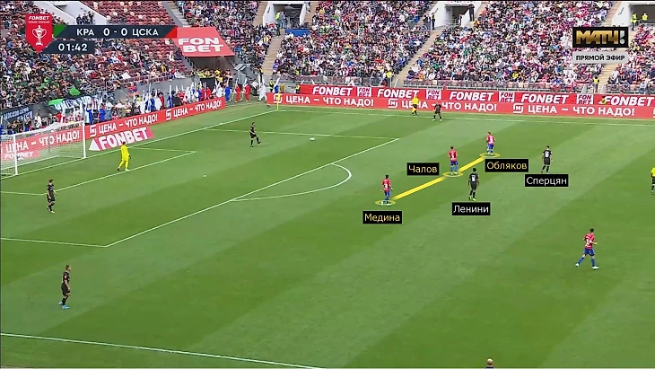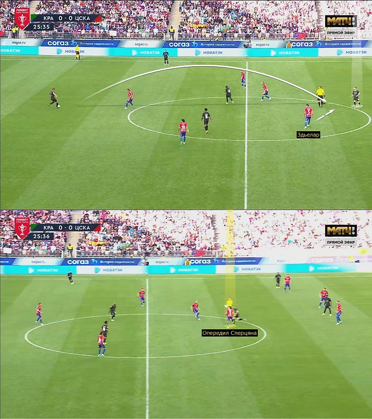 Зачастую ЦСКА двигался по цепочке (инсайд и опорник при атаке на противоположном фланге приближались к эпизоду). Это насыщало и фланг, где атаковал «Краснодар», и середину. Компактность в низком блоке позволяла контролировать навесы и подборы: Кордобе было сложно развернуться, атакующие игроки находились под давлением, доработки Медины-Чалова-Облякова за Ленини и крайними защитниками замедляли моментальный второй темп перед штрафной. Незадолго до перерыва к Сперцяну все же долетела скидка Кордобы, но после неудачной обработки его заблокировали Набабкин и Дивеев – в первом тайме после пропущенного гола «Краснодар» больше ничего не создал.