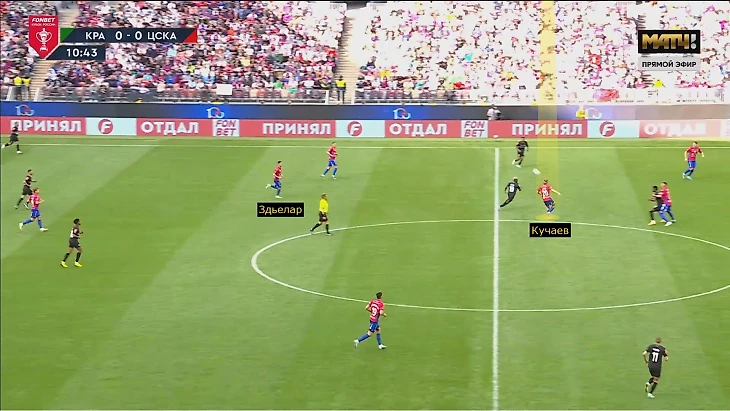 Для начала мини-контекст. В шестом пункте мы уже частично затронули, что Кучаеву приходилось страховать, когда Здьелар поднимался выше за Сперцяном. «Краснодар» редко пользовался зоной в первом тайме, хотя однажды все же прорвался. Казалось, что ЦСКА запрессинговал защитников и Ленини, но Арутюнян умно перевел налево. Неожиданная смена флангов застала защитников врасплох: Набабкин не успел к Рамиресу, а Дивеев высоко поднялся, но не накрыл Олусегуна. Это привело к шикарному рывку Баши в оголенную зону и заблокированному удару из штрафной.