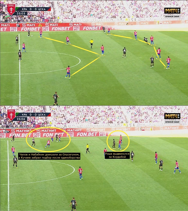 В среднем блоке ЦСКА закрывал середину, чтобы минимизировать проникающие передачи и направить «Краснодар» на фланги. На краях ЦСКА становился агрессивнее. Зачастую инсайд, ближайший полузащитник, латераль и крайний центральный защитник превосходили «Краснодар» или создавали ситуацию 4-в-4.