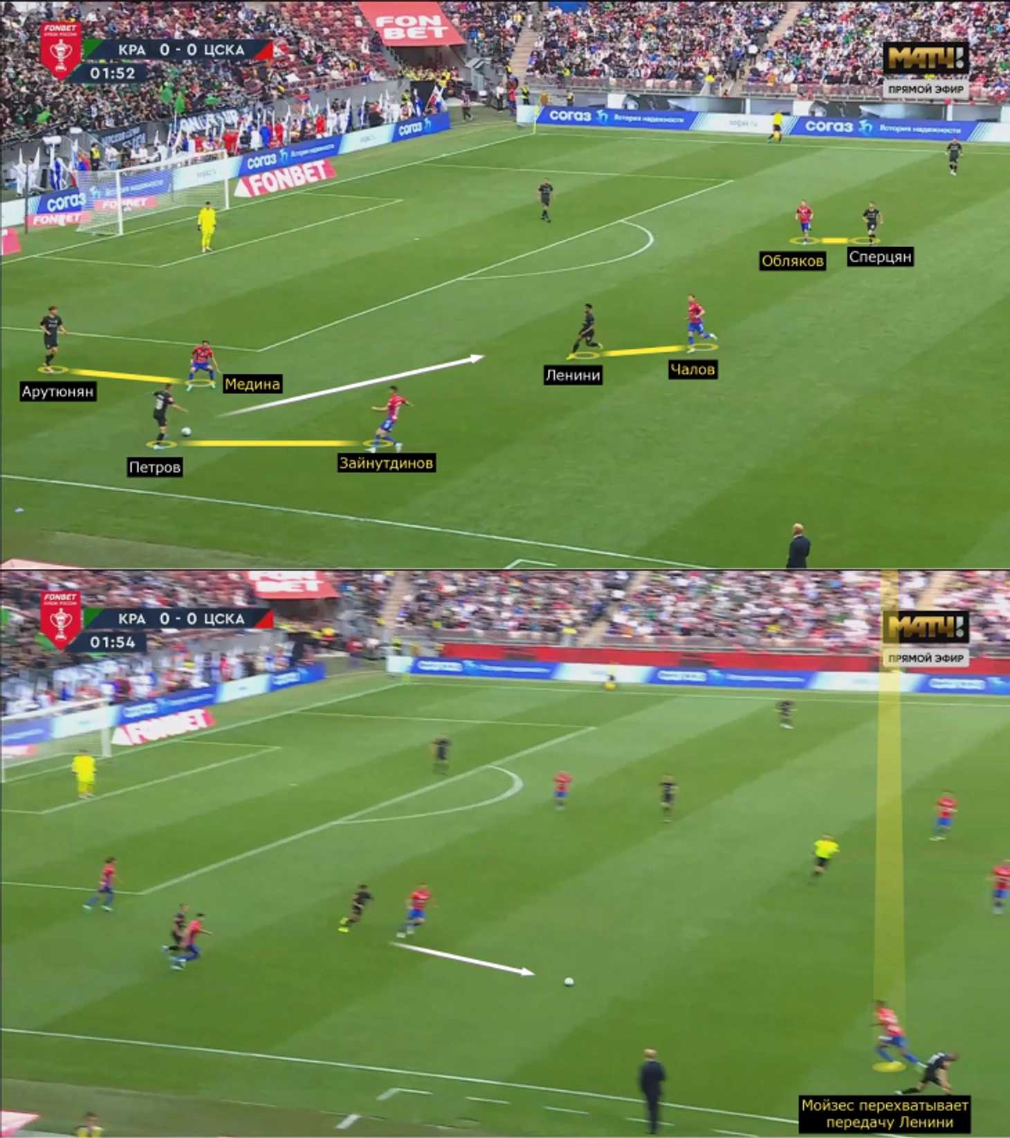 Например, «Краснодар» ошибался под давлением: сначала Агкацев неудачно перевел Рамиресу (по центру все были разобраны, Чалов перехватил плохой пас), а затем Мойзес перехватил передачу Арутюняна.