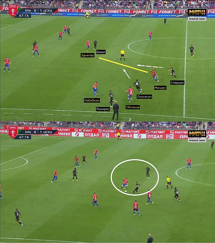 Эпизод с желтой карточкой Здьелара – пассивный прессинг плюс хороший переход с левого фланга в середину. Обляков дал время Рамиресу, Олусегун принял мяч спиной к воротам и отыграл Мендеса, упустившего Сперцяна. В итоге Здьелар сфолил, а за ним оставался свободный Баши. В похожей ситуации предупреждение схватил и Обляков: грубо встретил Рамиреса (снова не успел накрыть, Кристиан его отрезал передачей), а Олусегун опередил Набабкина.