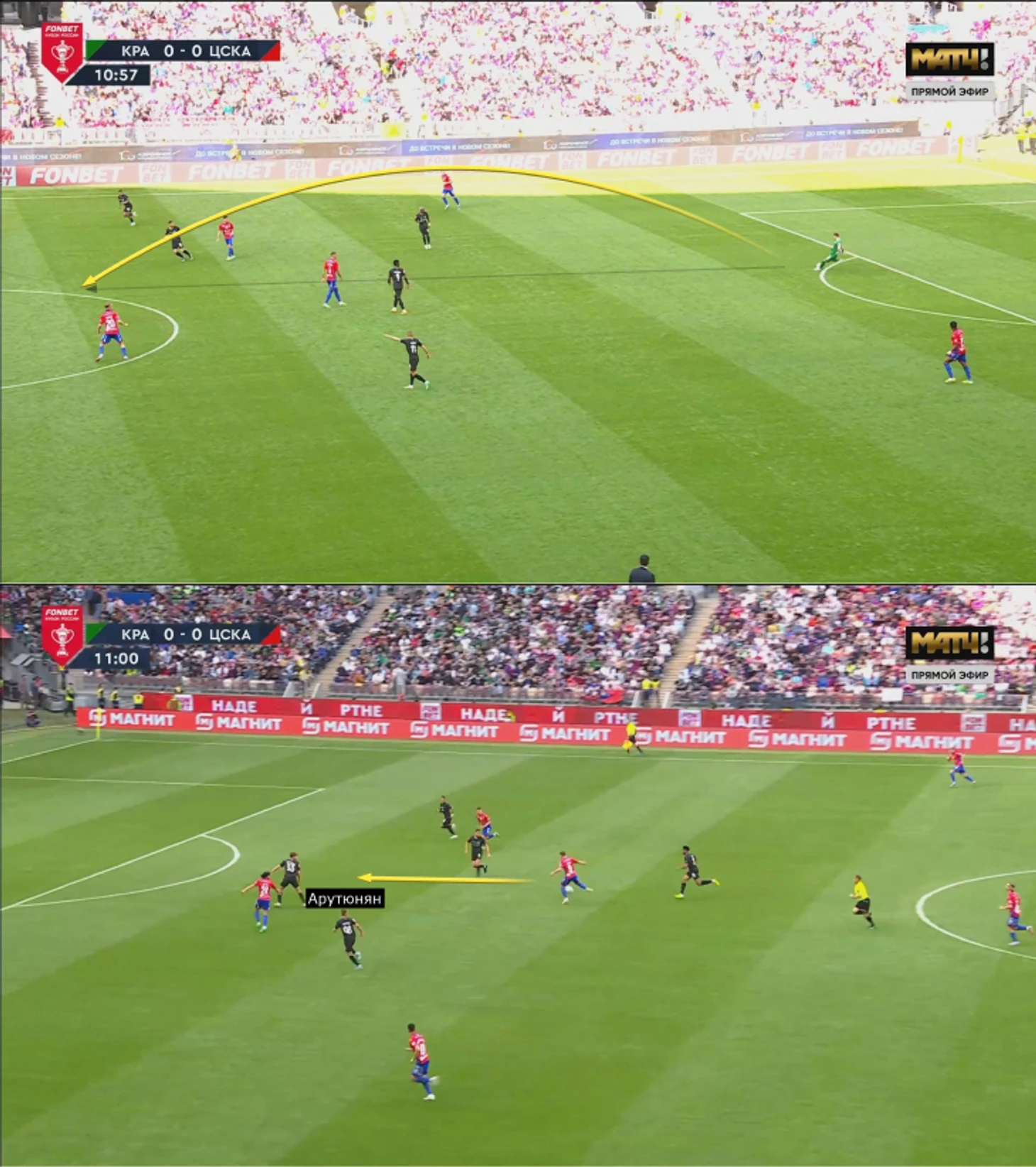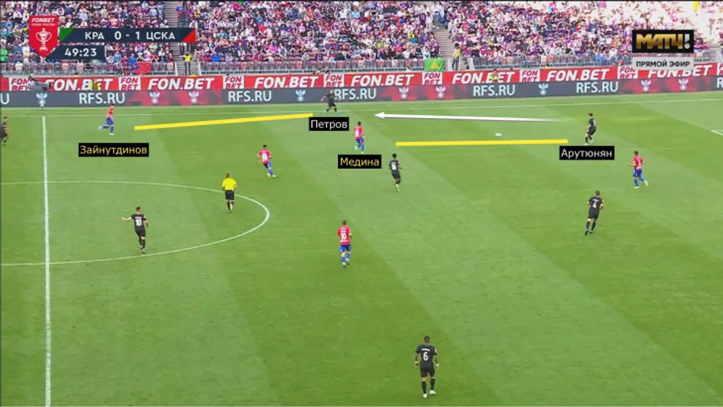 Первая фаза голевой атаки так и началась: сначала Арутюнян, а затем и Петров без особых проблем сделали свои передачи.