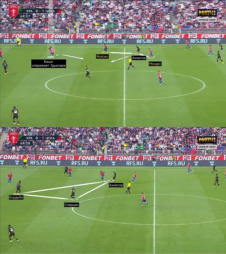 «Краснодар» идеально воспользовался забеганиями Баши и Ахметова: Жоао принял мяч спиной к воротам и отрезал Здьелара, а Ильзат сначала отклеился от Мойзеса, а затем опередил Мендеса и продлил на Кордобу.