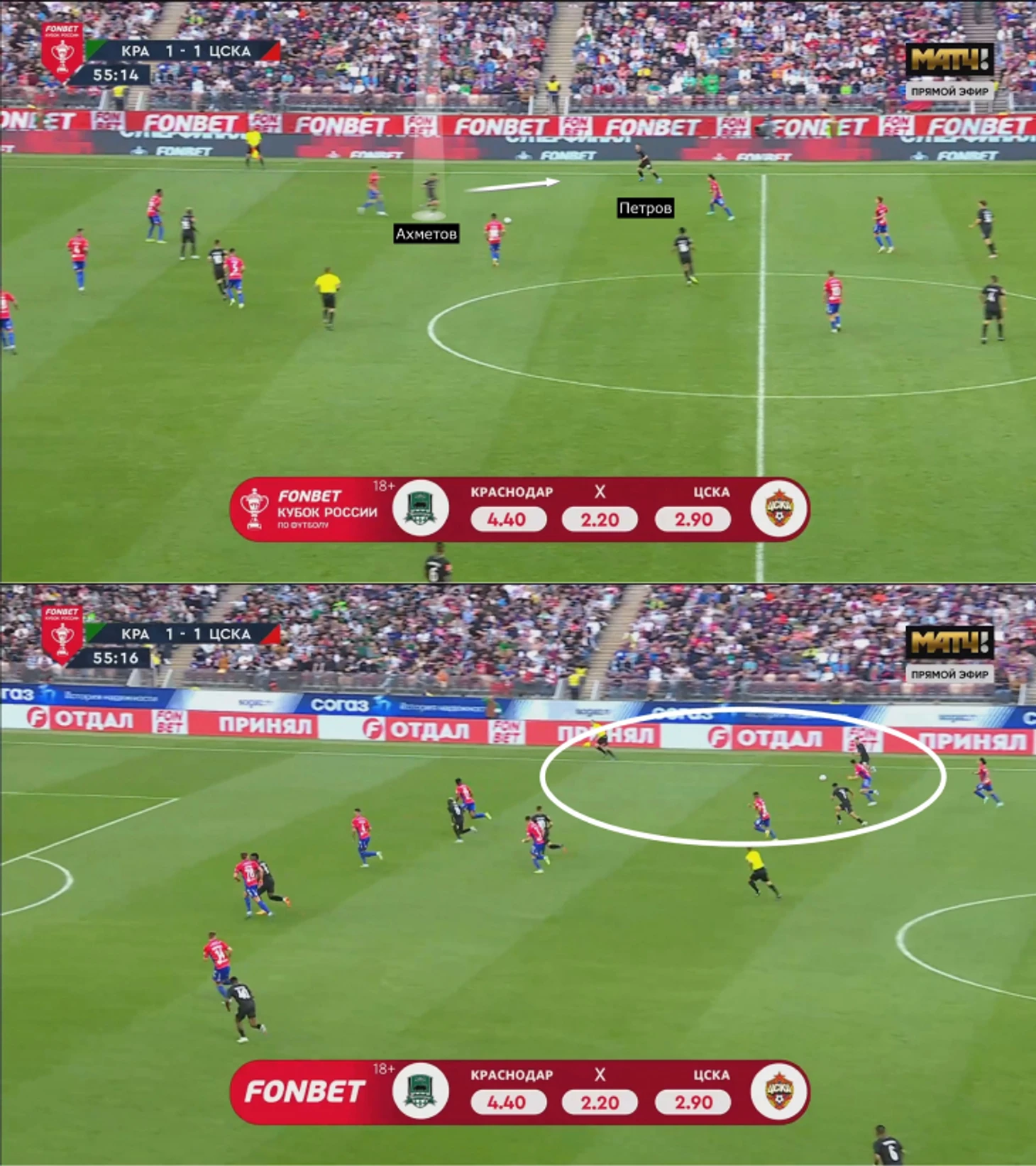 • Старт второго тайма: выход Ахметова освежил игру, а ЦСКА постепенно терял прессинг-настрой, из-за чего переход в атаку «Краснодара» упростился.