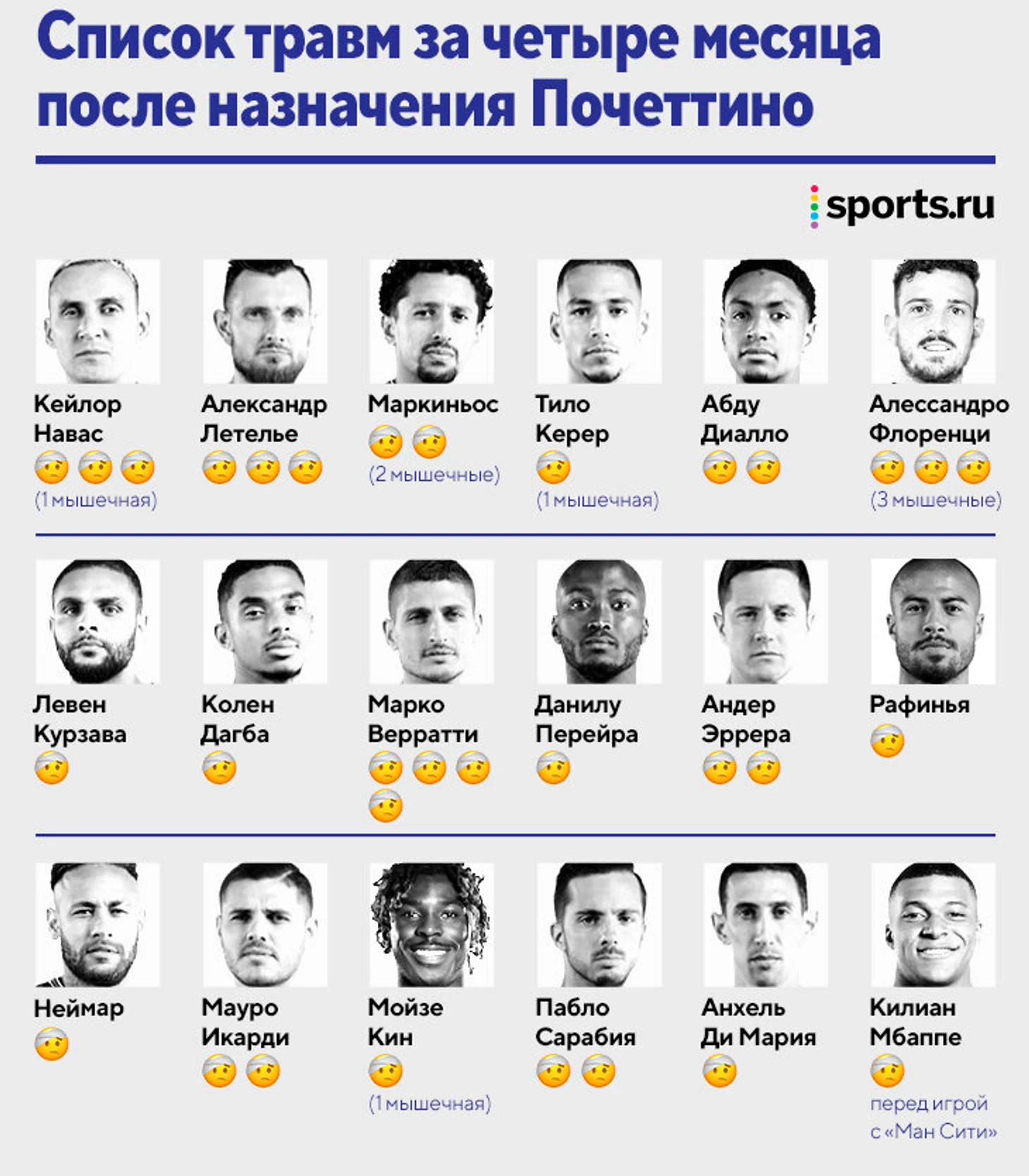 Но, кажется, такой турбо-режим посреди сезона не пошел «ПСЖ» на пользу. Оцените список травм за четыре месяца после назначения Почеттино: