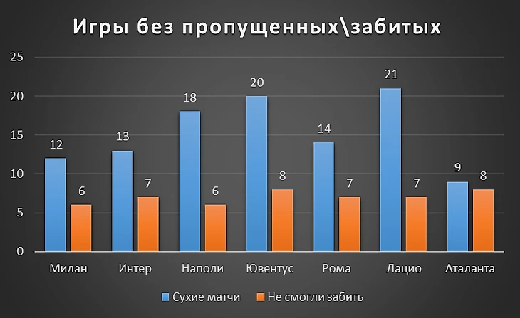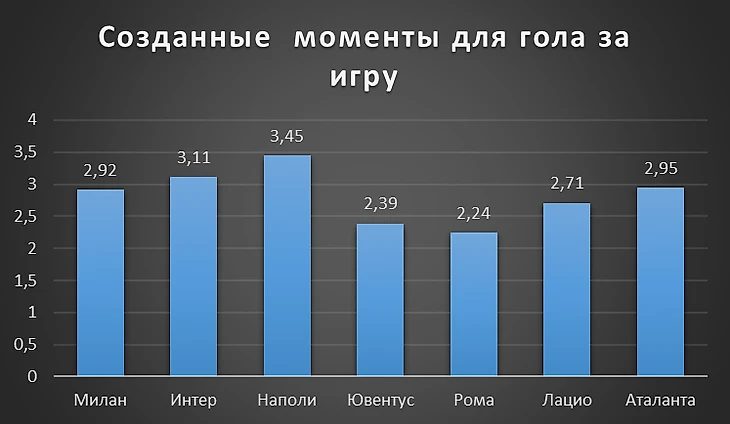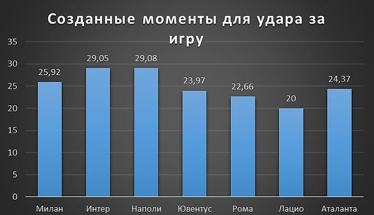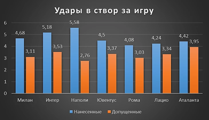Наполи проводит феноменальный сезон, однако по качеству игры в атаке Интер не хуже. Не так и далеко Милан. Лацио создает немного моментов за игру, но редко промахивается и имеет самый большой процент попадания в створ среди «большой семерки» - 37,4.