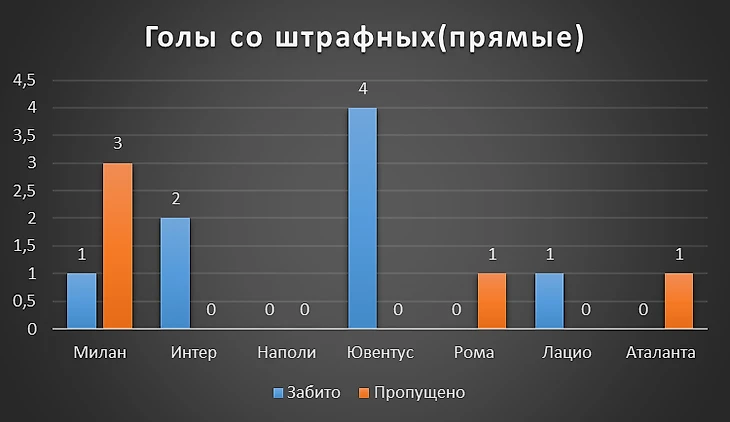Если «аззури» не могли решить вопросы с игры, то частенько решали их с игры. Следом идут мастера стандартов и игры от обороны Аллегри и Моуриньо. Милан - единственная команда, кто пропустил с угловых, больше, чем забил. И хотя сама цифра довольно нормальная среди топ-7, сам факт не радует.