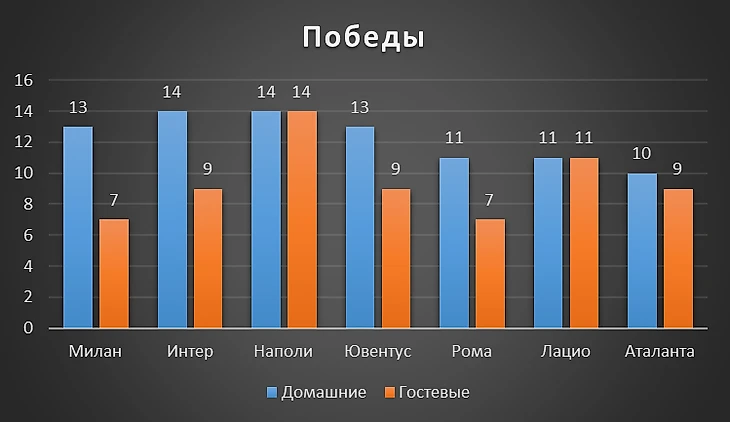 Если кто-то был одинаково успешен, как на выезде, так и дома, как команды Спалетти и Сарри, то вот команда Пиоли одержала всего 7 побед на выезде - наименьшее число за 3 сезона с доном Стефано у руля! Столько же побед у банды Моуриньо, но общее количество побед у римского коллектива меньше, чем у «россонери».