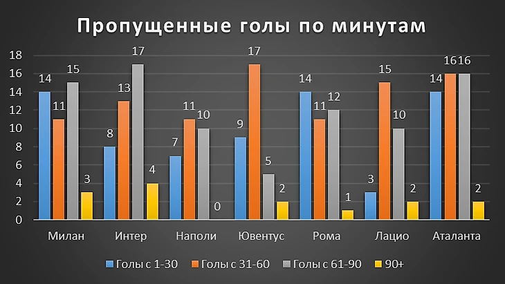 Парни в красно-черном отлично начинают матчи: 21 гол в течение первого получаса - наибольшее число голов среди всей топ-7. Однако и пропускают предостаточно в первые 30 минут. Чего не скажешь о Лацио - лишь 3 гола в первые 30 минут за весь сезон. И примечательно, что 2 гола забил именно Милан.
