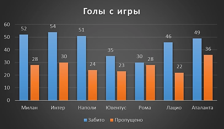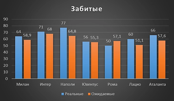 «Нападение выигрывает матчи, оборона выигрывает титулы» - футбольная пословица. И у Наполи, на радость фанам, все совпало воедино. Лучшие и по ожидаемым, и по пропущенным. Следом идет команда Сарри с 30 пропущенными, хотя по ожиданиям заслуживала худшего. Третье место у дона Аллегри и его Ювентуса. Самая легкопроходимая оборона у Аталанты - 48, это на 5 голов больше, чем у ближайшего оппонента - Милана, чья оборона была болезненна зимой.