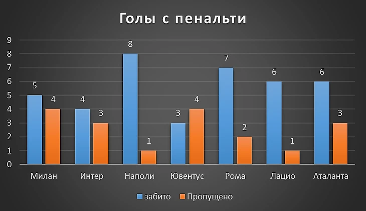 Футболисты Наполи били пенальти 8 раз, чаще всех. К слову, команды, ориентированные на владение, Лацио и Наполи пропустили лишь один раз с пенальти. В чем сила, брат? Во владении. Вслед за ними Рома с 7 точными попаданиями. Милан, у которого в позапрошлом сезоне было аж 15! голов с пенальти, уже второй сезон забивает только 5.