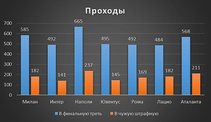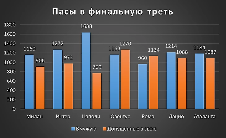 Неаполь тут лидирует с большим отрывом, в среднем отдавая пас в треть соперника 43 раза за матч. Ближайший преследователь Интер переводит в финальную часть поля 33 раза. У Милана тут 6 показатель, который объясняется просто.