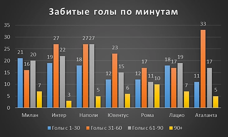 После 30 минуты на протяжении получаса говорим уже об Аталанте. Первые 30 минут дружина Гасперини просыпается, но за 15 минут до перерыва и столько же после него «взрывает» на поле! График, к слову, напоминает вулкан, который просыпается к 30-й минуте. Что-то аналогичное можно наблюдать и у Ювентуса. У Милана после стартовой 30-минутки садятся батарейки, что выражается в наименьшем количестве голов за вторую треть матча.