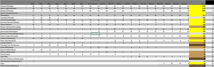 Уважаемые читатели, добрый день. На любом спортивном портале постоянно бушуют споры о том, чей клуб круче, значимей и сильнее. Я решил дать по максимуму объективную оценку без привязанности к собственным пристрастиям. Для этого я изучил результаты всех чемпионатов и кубков России и СССР, присвоил каждому месту стоимость в баллах – по принципу Ф1 или Кубка Мира в биатлоне. Результаты свел в единую таблицу, фрагмент ниже: