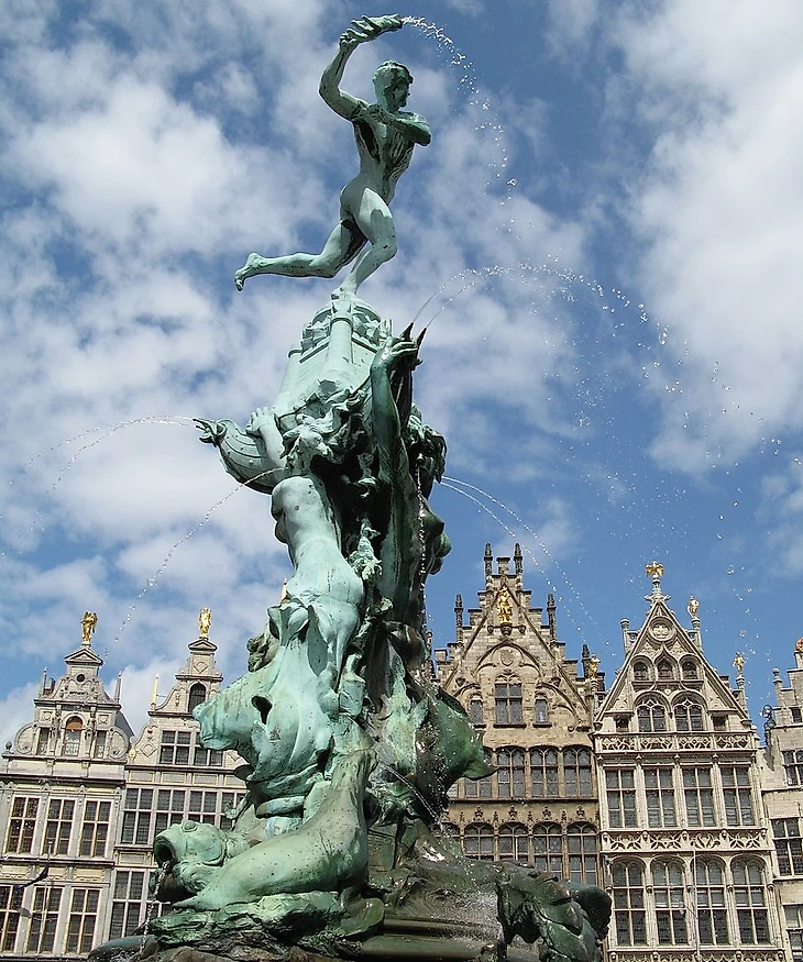 У Антверпена очень интересное название. Согласно легенде, на берегу реки Шельда жил великан, звали его Дрюон Антигон. Он считал себя прирождённым таможенником и требовал плату со всех кораблей, проплывавших мимо него по Шельде, а если капитан корабля отказывался платить, великан отрубал ему руку и бросал её в воду. Продолжалось это до тех пор, пока один римский солдат, Сильвий Брабо, не вызвал на бой таможенника-террориста. Римлянин его победил, убил, и поступил с ним так же, как тот поступал с несчастными капитанами – отрубленную руку великана Брабо бросил в Шельду. От этого бросания руки», hand werpen по-нидерландски, и произошло, согласно легенде, название места «Антверпен». Сегодня перед ратушей Антверпена находится Фонтан Брабо со скульптурой римлянина, который бросает отрубленную руку великана.