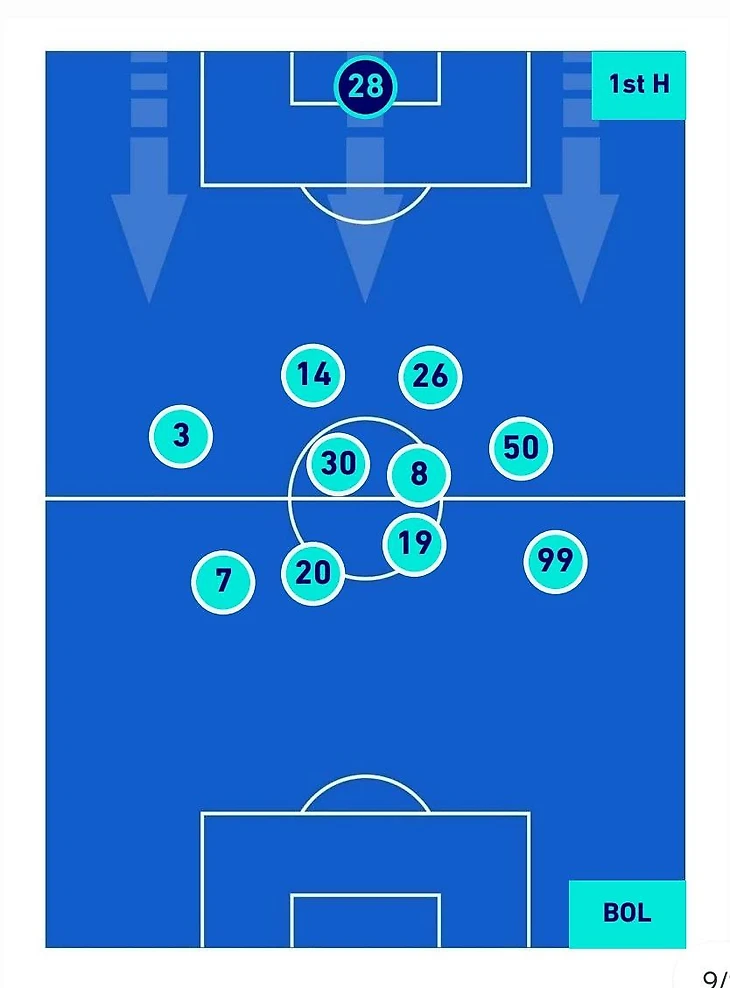 Изоляция фланга Орсолини достигается за счет смещения акцентов владения к левому флангу. В целом по сезону Мотта отдавал предпочтение разнонаправленным флангам: условно – один атакующий (чаще всего – правый фланг), один – более сбалансированный (на разных отрезках сезона слева выходили Эбишер, Сориано и даже Домингес). Заполнение штрафной соперника осуществляется не только посредством нахождения там профильного центрфорварда, но и подключений полузащитников из глубины поля (чаще всего такая функция отводилась Фергюсону).