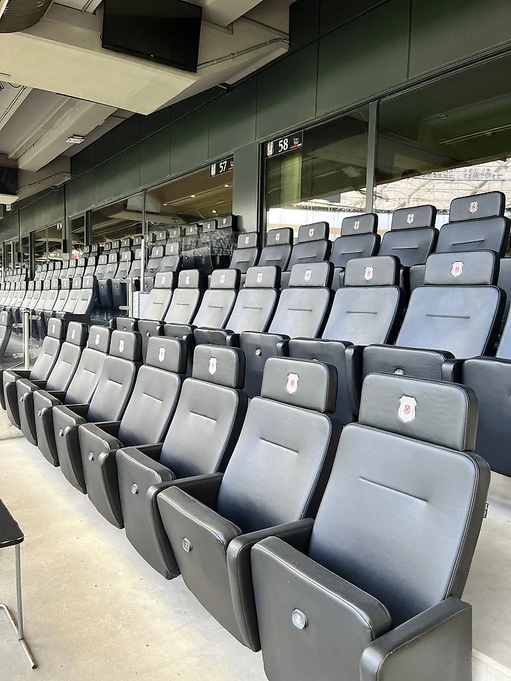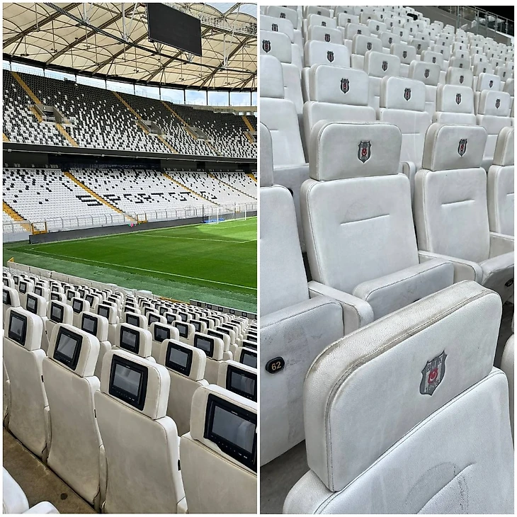 Затем поднимаемся на центральный вип-сектор. Белые кресла уже потрепаны жизнью, в спинку каждого встроен экран. Кресла очень прямые, а расстояние между рядами не очень большое - по комфорту дорогих мест есть вопросики. В ложе посидеть не дали.