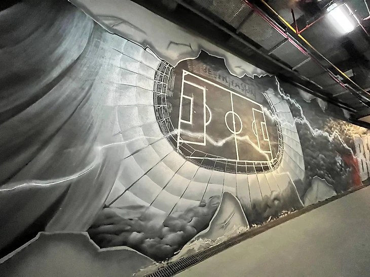 Экскурсия начинается на улице со въезда на парковку для команд. Весь проезд украшен огромными и впечатляющими граффити. Проскользнула мысль, что команду родные черные цвета поддерживают, а на соперника могут оказать необходимое давление уже с момента прибытия на стадион.