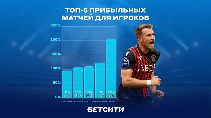 Рекорд по прибыли с одного конкретного матча был зафиксирован в игре Лиги 1 «Ланс» — «Ницца». Хозяева подходили к ней безоговорочными фаворитами. Коэффициент на победу «Ланса» в прематче составлял 1.83, а на успех «Ниццы» – 5.70. К тому моменту команда Франка Хайзе выиграла все 10 домашних встреч. Несмотря на высокий кэф, игроки БЕТСИТИ поверили в победу гостей. Один из бетторов загрузил 500 000 рублей на «Ниццу». Риск оправдался. Андердоги выиграли со счетом 1:0, а игроки БЕТСИТИ оказались в плюсе на 207%.