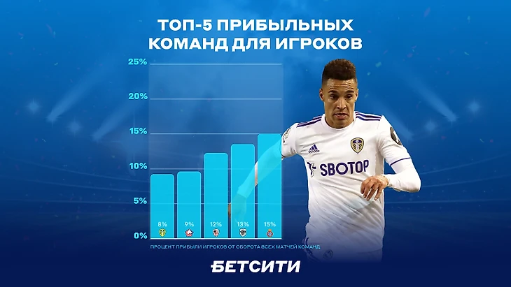 Самая прибыльная команда для наших игроков — «Эспаньол». Каталонцы принесли клиентам больше всего прибыли — 15% на дистанции всего сезона. Они стали рекордсменами лиги по числу ничьих (13) и не смогли сохранить прописку в Примере. В лидерах по доле прибыли также французские клубы — «Анже» (13%), «Аяччо» (12%) и «Лилль» (9%) и английский «Лидс» (8%).