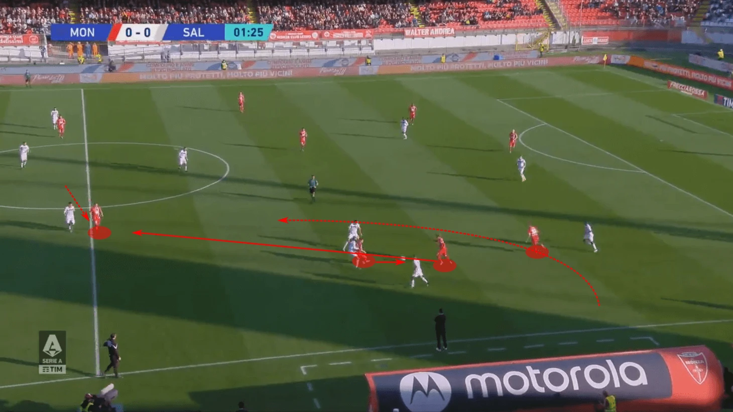 Палладино стал всё чаще использовать трюк с освобождением зон в центре и атаке. Наставник «бьянкоросси» стремился избегать прямой борьбы за мяч, овладев техникой бесконтактного боя. Как это работало? В билд-апе футболисты используют короткий пас, постепенно выбираясь из-под прессинга в шахматном порядке: сделал пас – перебежал вперёд на пару метров, снова принял, отдал, а затем вновь поменял позицию на более высокую. Таким образом соперник вынужден стягивать к перепасовывающимся всё больше сил, освобождая как коридоры, так и полноценные зоны на своей трети. Этим и пользуются подопечные Палладино, забрасывая мяч в группу атаки. Скрин ниже – яркая иллюстрация.