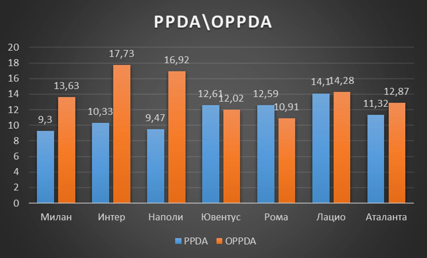 O любимом (и не очень) PPDA. Ниже представлена инфографика, наглядно демонстрирующая необходимость контекстного погружения в метрику интенсивности прессинга: «Интер», если отбросить и OPPDA, и рисунок игры команды, мнимо кажется коллективом, выходящим из-под высокого давления хуже условного «Милана». На деле же парни Индзаги дадут фору своим соседям, ведь их тройка ЦЗ в лиге уступает лишь неаполитанской, но главное – другое. Высочайший OPPDA свидетельствует о безнаказанности «нерадзурри» после перехвата мяча. Благодаря подвижным латералям, которые в билд-апе активно участвуют в разгрузке центра обороны, «Интер» умело выходит со своей трети во вторую. Более того, те, кто следит за «змеями» весь сезон, однозначно обращали внимание на характер передач в начальной фазе: игроки используют лишь короткий пас в вертикальных продвижениях, и только бровочники задействуются для среднего паса.