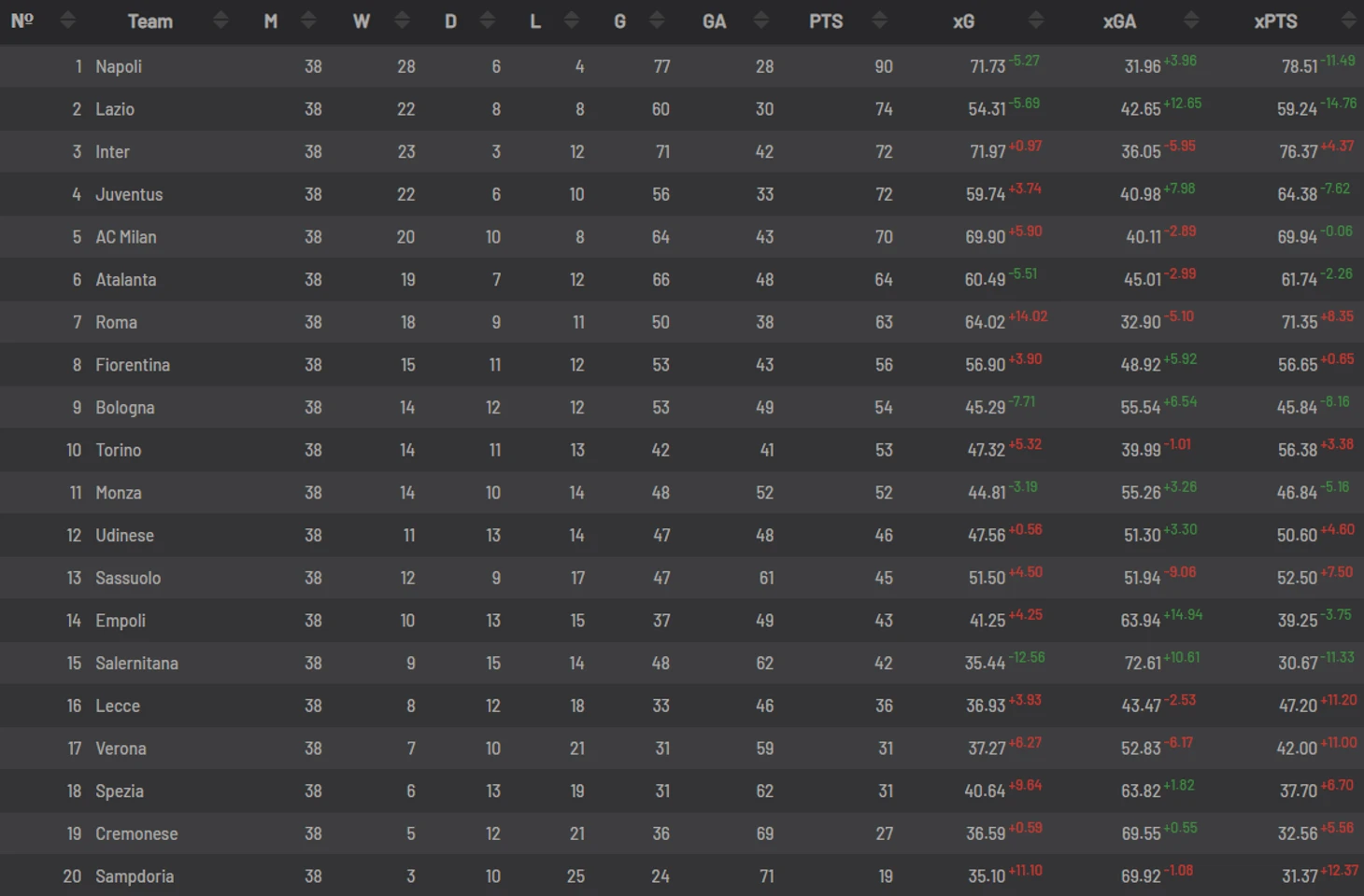 Ренессанс оборонительного футбола отчетливо прослеживается в показателях xGa: Серия А является лидером топ лиг по количеству команд, превзошедших ожидания по пропущенным мячам – 11. В число особых везунчиков вошли «Лацио» (+12,65), «Эмполи» (+14,94), а также «Салернитана» (+10,61). На ней, к слову, мы еще остановимся подробнее.
