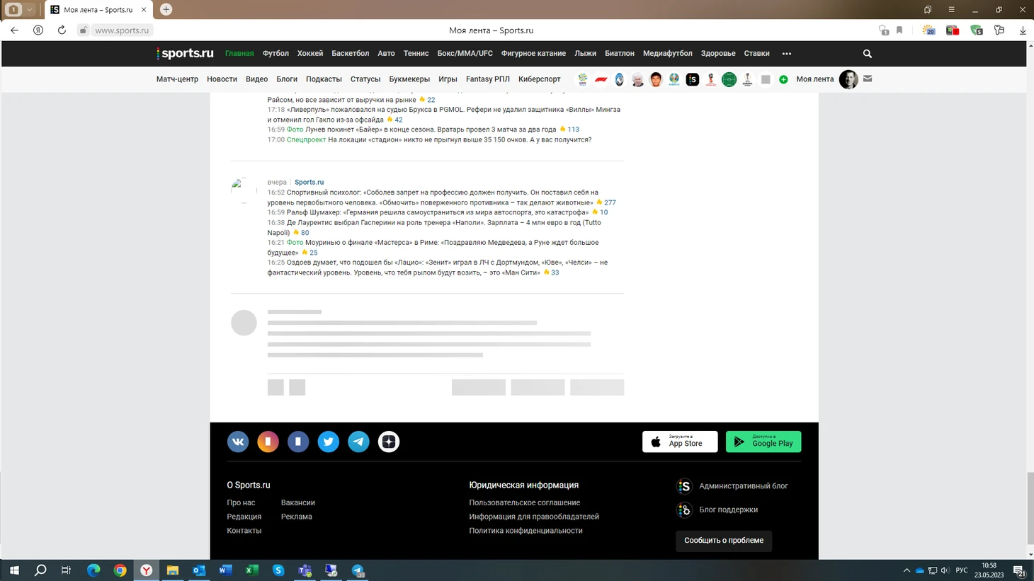22 мая у меня появилась проблема - не работает раздел "Моя лента". Просто не прогружается даже за вчерашний день (скрин ниже). Пробовал на разных ПК, в разных браузерах, с включенным и выключенным блокировщиком рекламы - ничего не меняется, лента не грузится. Привык пользоваться сайтом именно так, по-другому не могу.