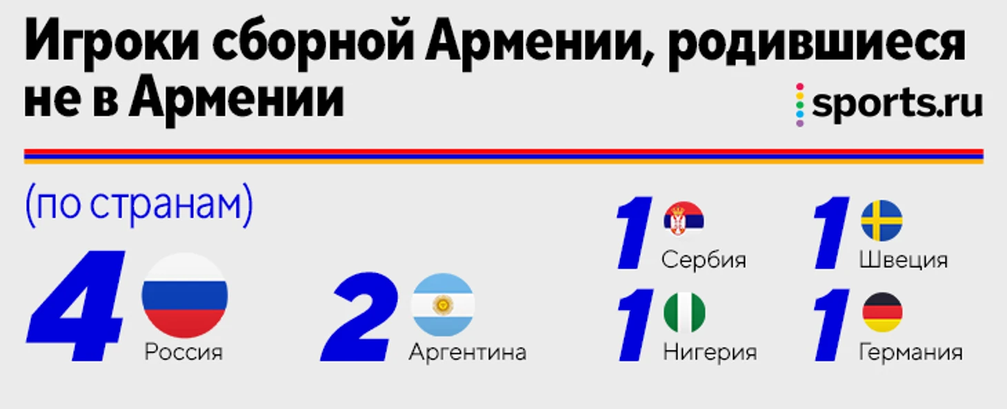Почему так происходит? Тут простое объяснение. Население Армении – 2,7 млн человек, а армянская диаспора по всему миру – это 10-12 млн. Поэтому сборная и ищет игроков повсюду, даже если они не знают армянский и связаны со страной только через родственников.