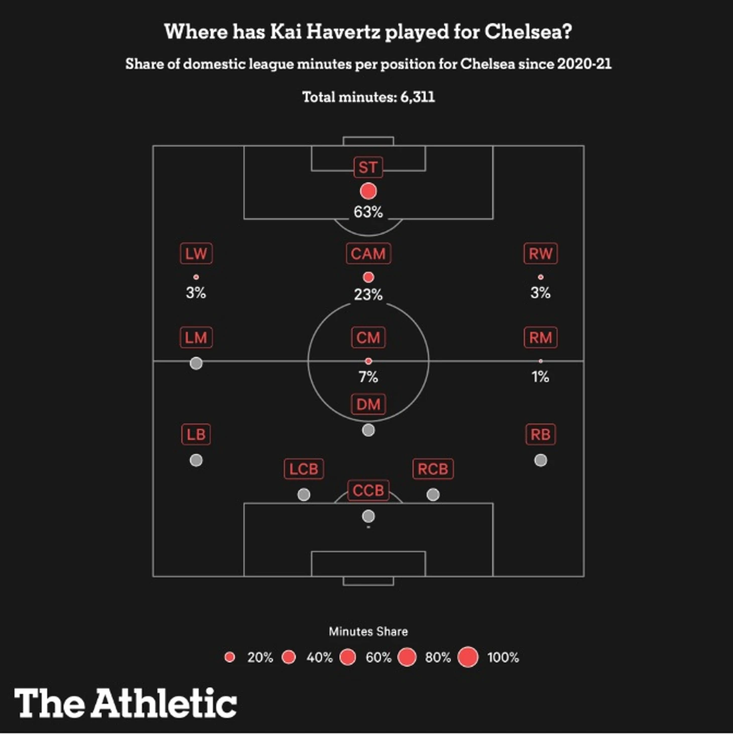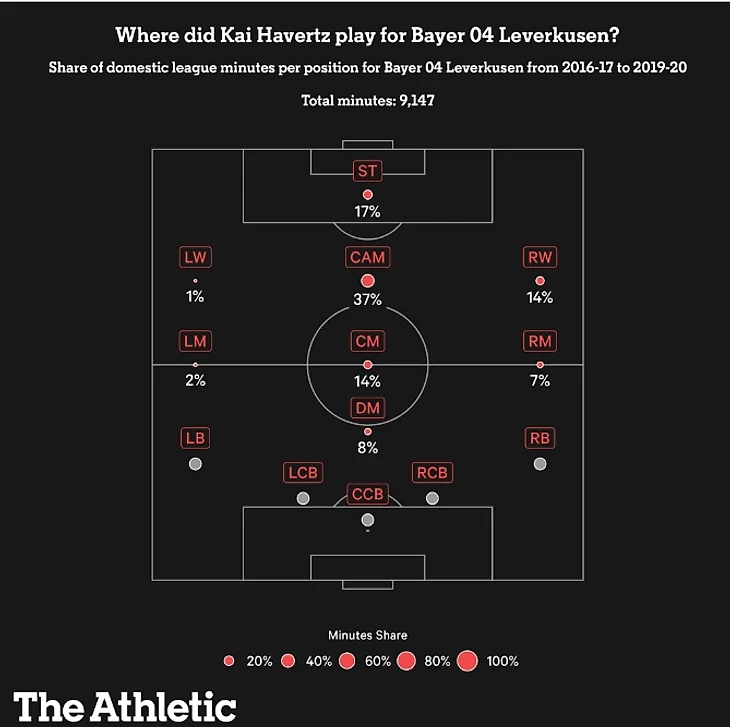 В Англии Кай использовался в роли наконечника 63% времени за 6, 311 минут, проведенных в АПЛ с сезона 20/21. В "Байере" всего 17%.
