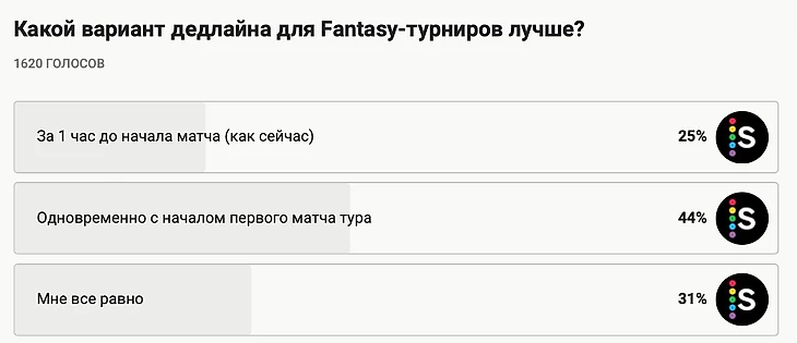 Пришло время подвести итоги нашего голосования по дедлайнам на новый фэнтези-сезон. Мы собрали большое количество ответов, и по результатам голосования победил вариант дедлайна «Одновременно с началом первого матча тура»: