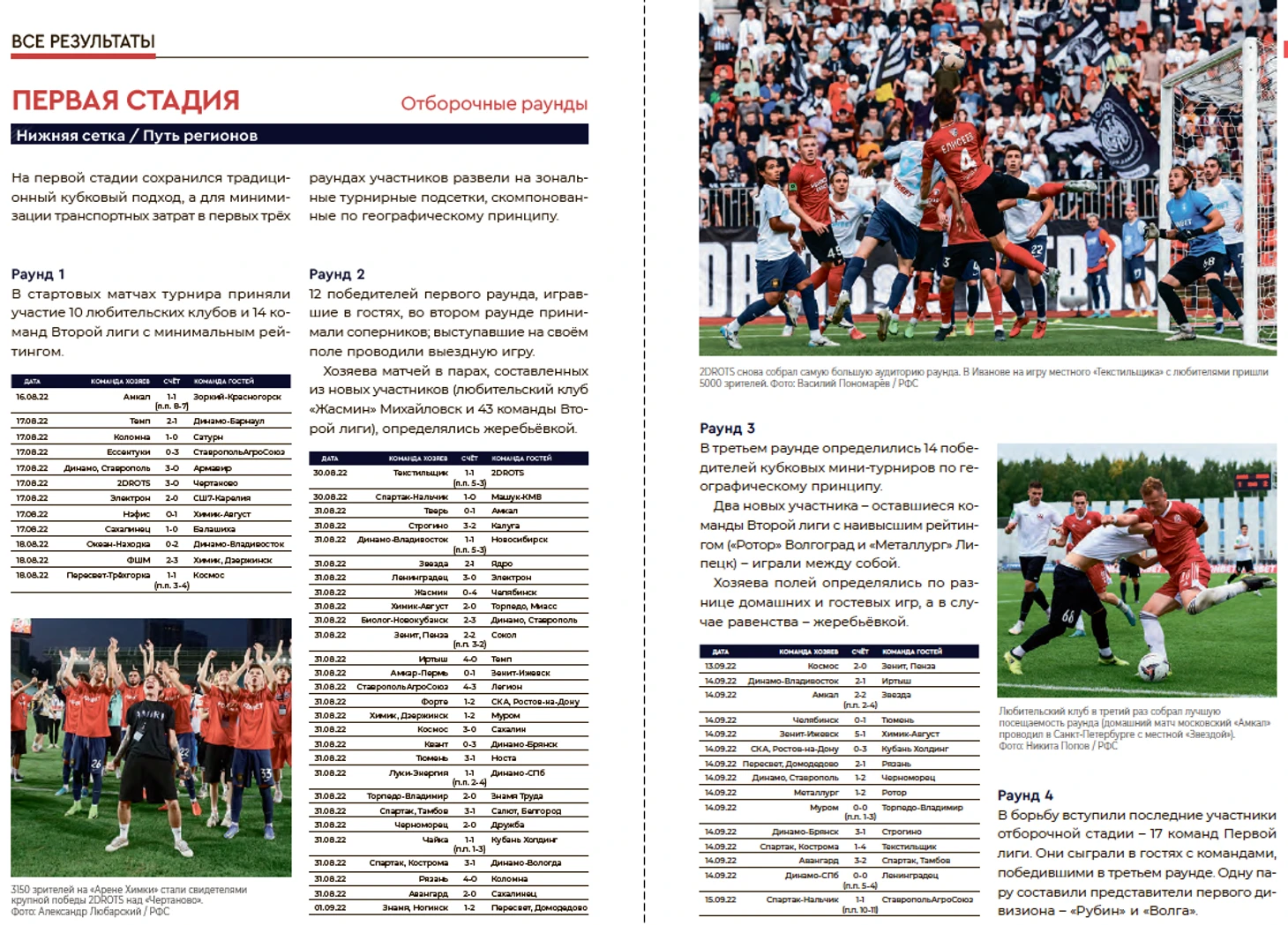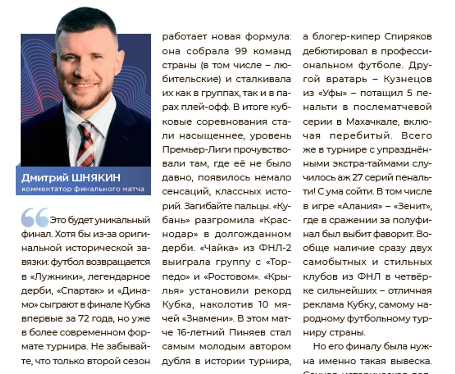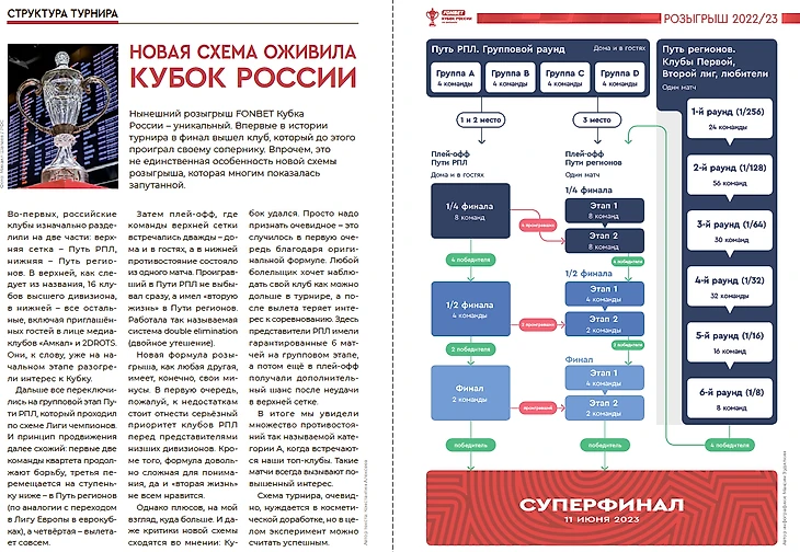 Проанализировав прошлогодний продукт (также созданный по заказу РФС) к финалу Кубка России 2021/22, нашли в нём что-то похожее на детали о прошедшем тогда розыгрыше только в монологе Дмитрия Шнякина, которого попросили поделиться мнением перед матчем. Из 40 страниц того выпуска про сам турнир говорится только в одном полосном материале!
