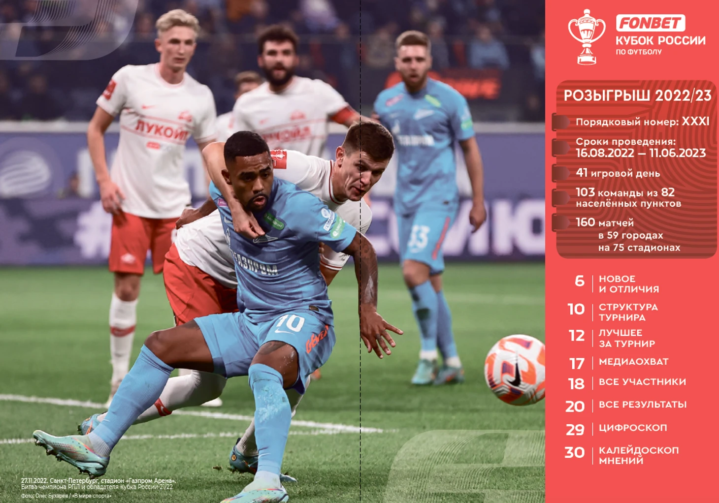 Нынешний розыгрыш Кубка страны – первый под титульным партнёрством FONBET. В турнире произошли значительные изменения. В центральном материале журнала мы выделяли, что это большие призовые и новая структура розыгрыша. Затронули перемены и предматчевое издание. Отрадно, что, кроме текста (в этот раз у нас места хватило) о новинках и отличиях турнира, завершившемуся розыгрышу посвящён целый раздел (издание состоит из трёх разделов, два других отведены Суперфиналу и Истории турнира) – 25 страниц.