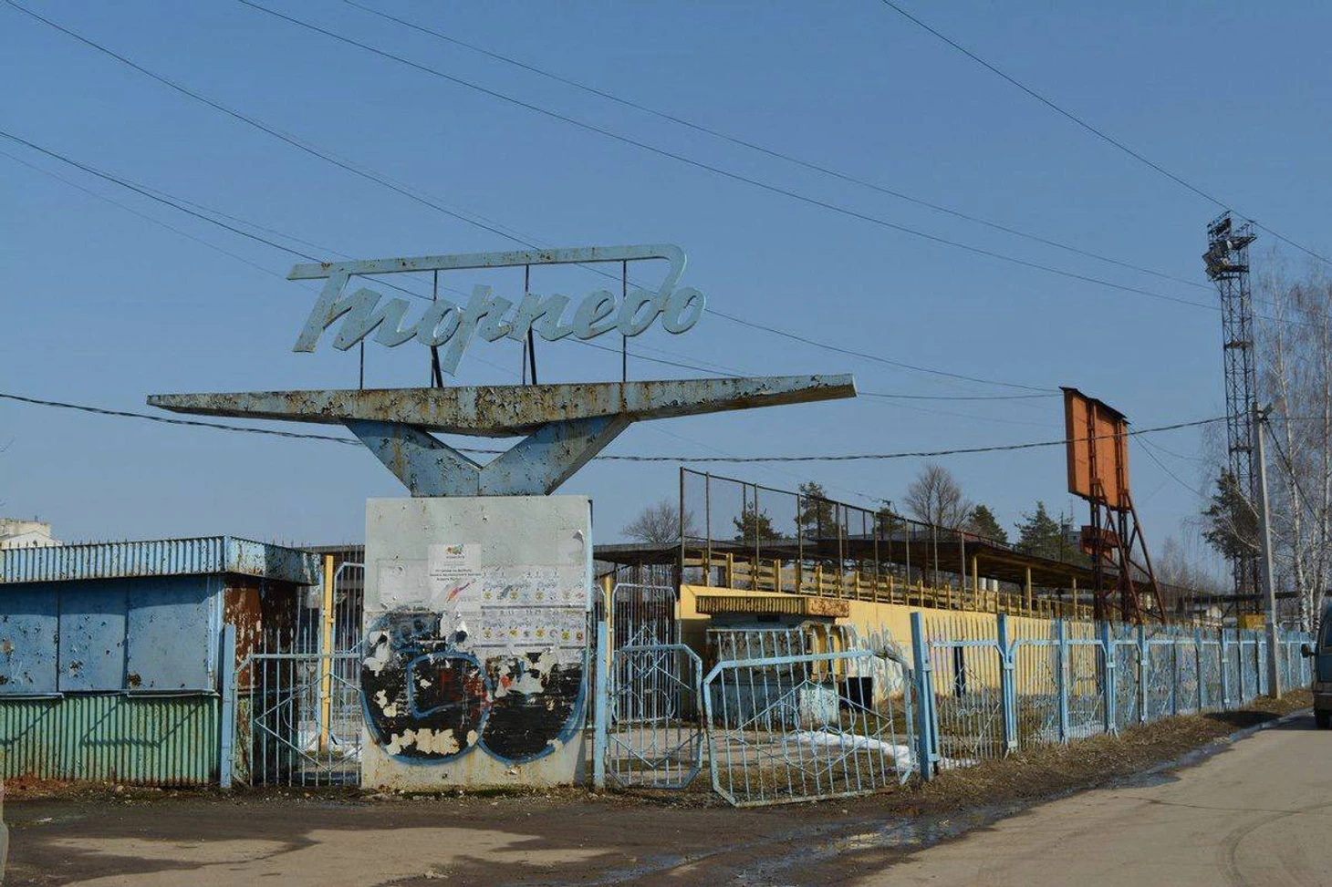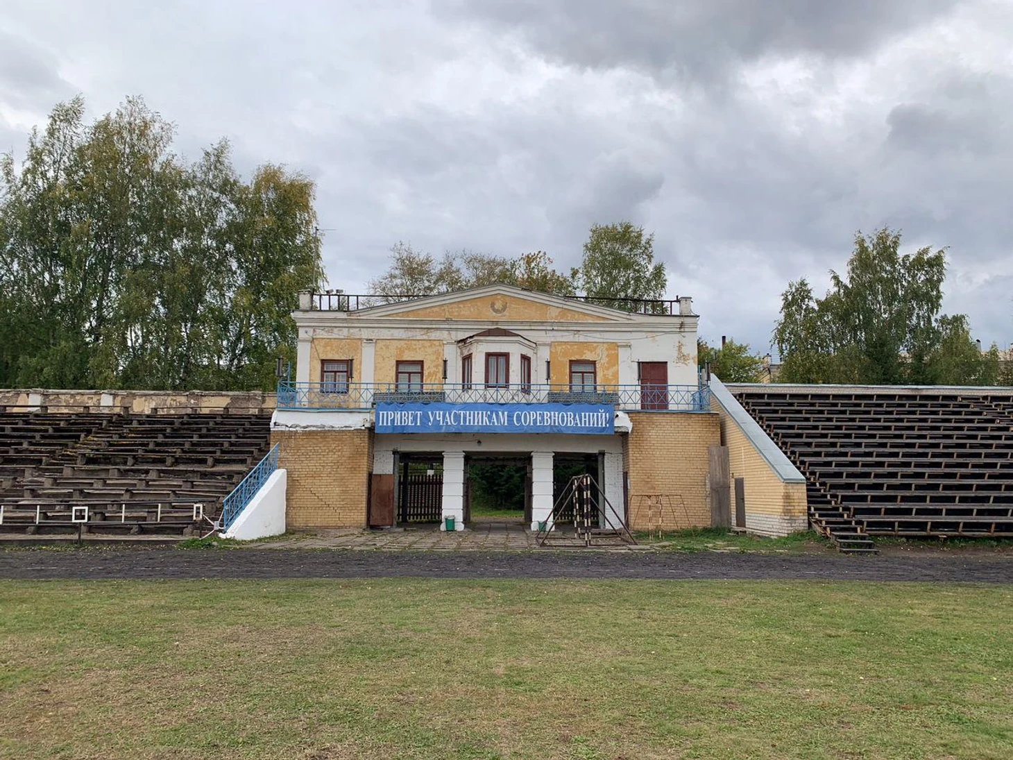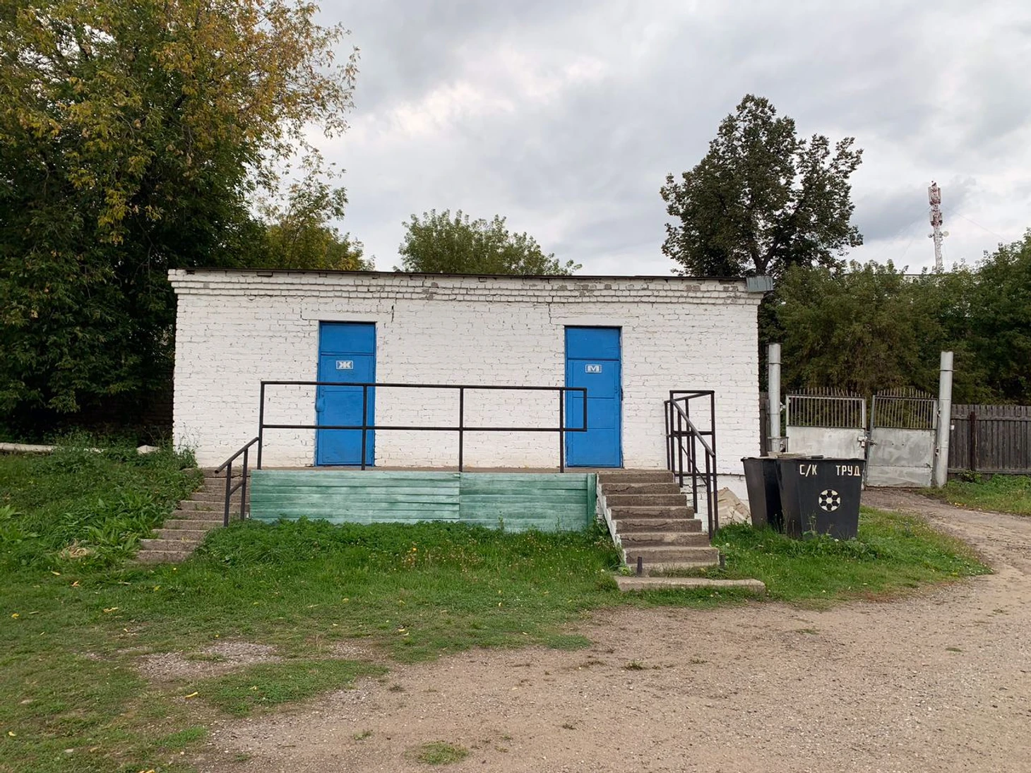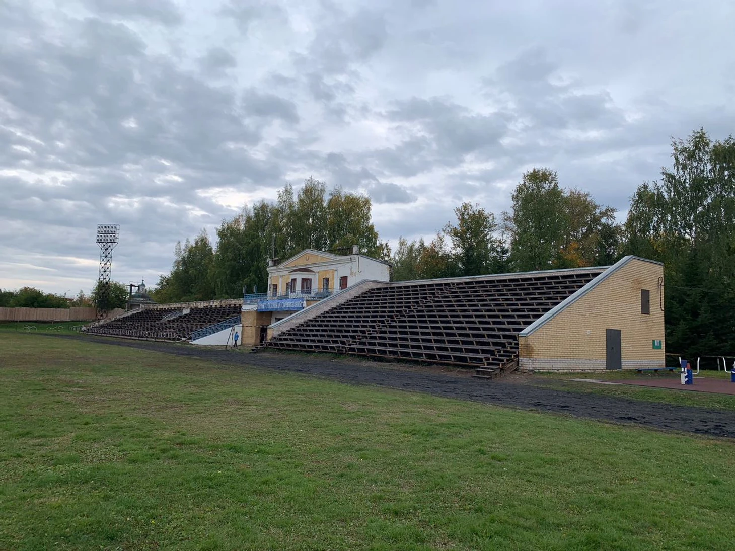 Обратите внимание на отдельностоящие душевые, обнесённые деревянным настилом. Ещё не так давно здесь жил футбол. Сейчас же проводятся соревнования по мотокроссу, из-за которых на забор, разделяющий территорию стадиона и городского некрополя, повесили колючую проволоку, чтобы желающие посмотреть действо и не платить за билет не залезали на ограду.