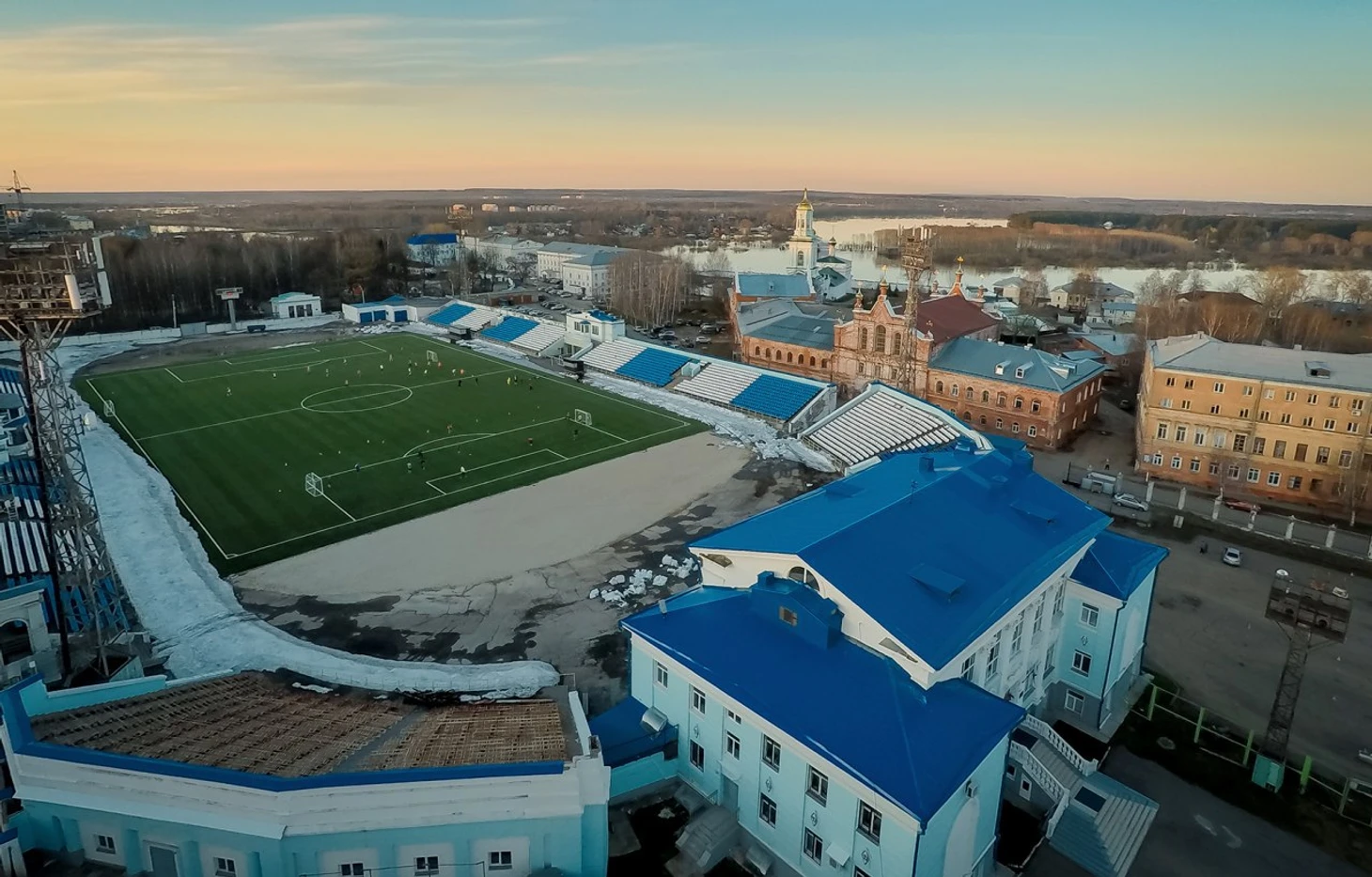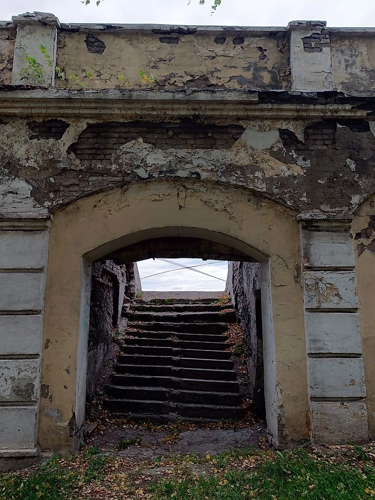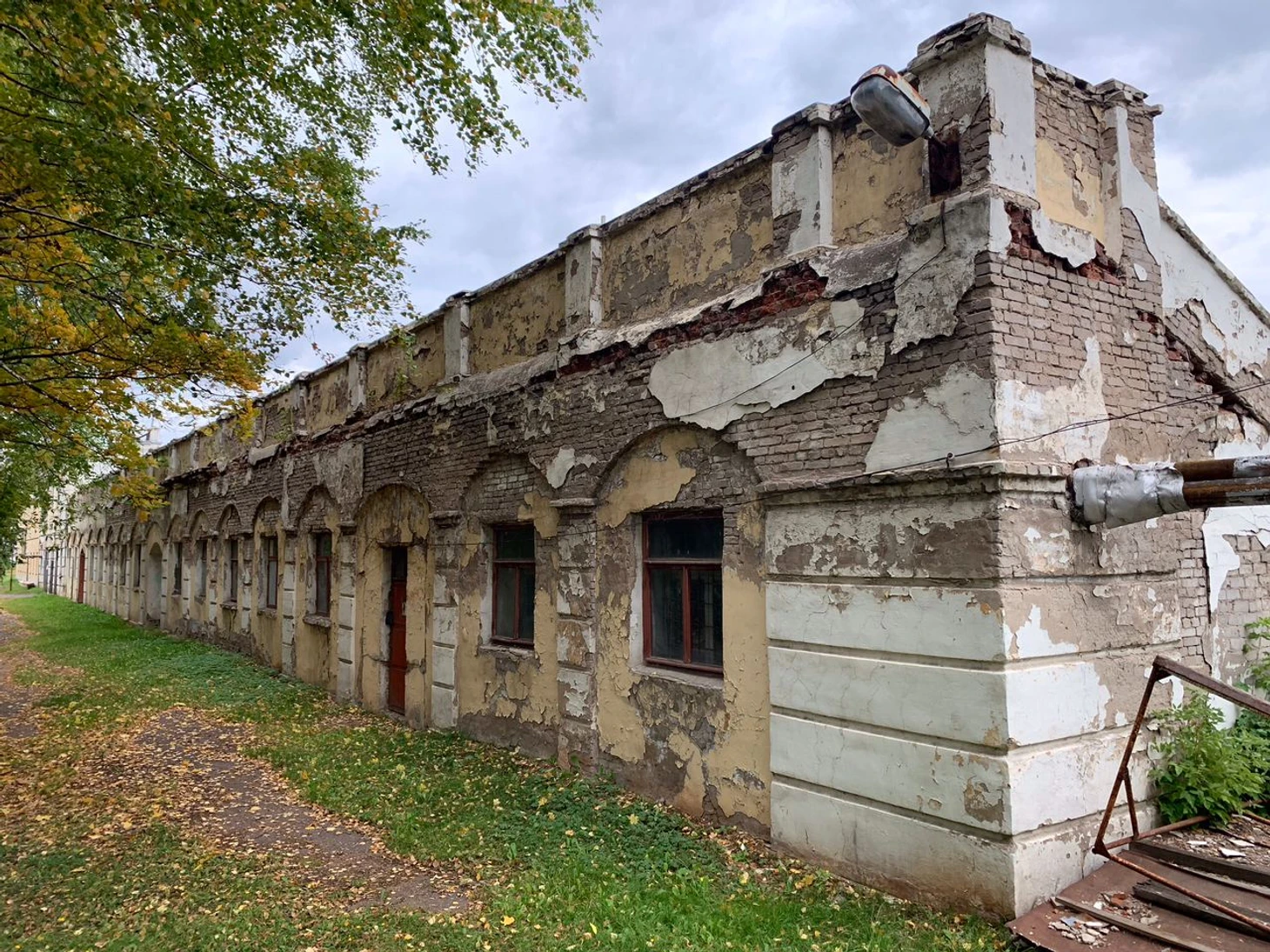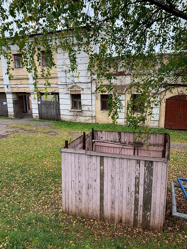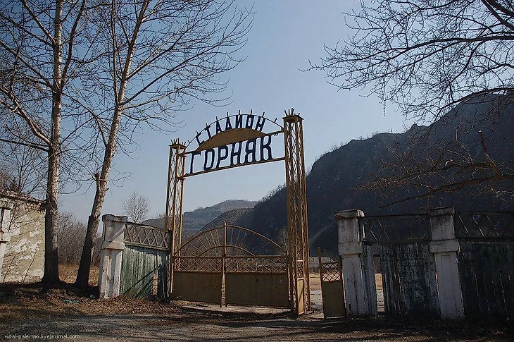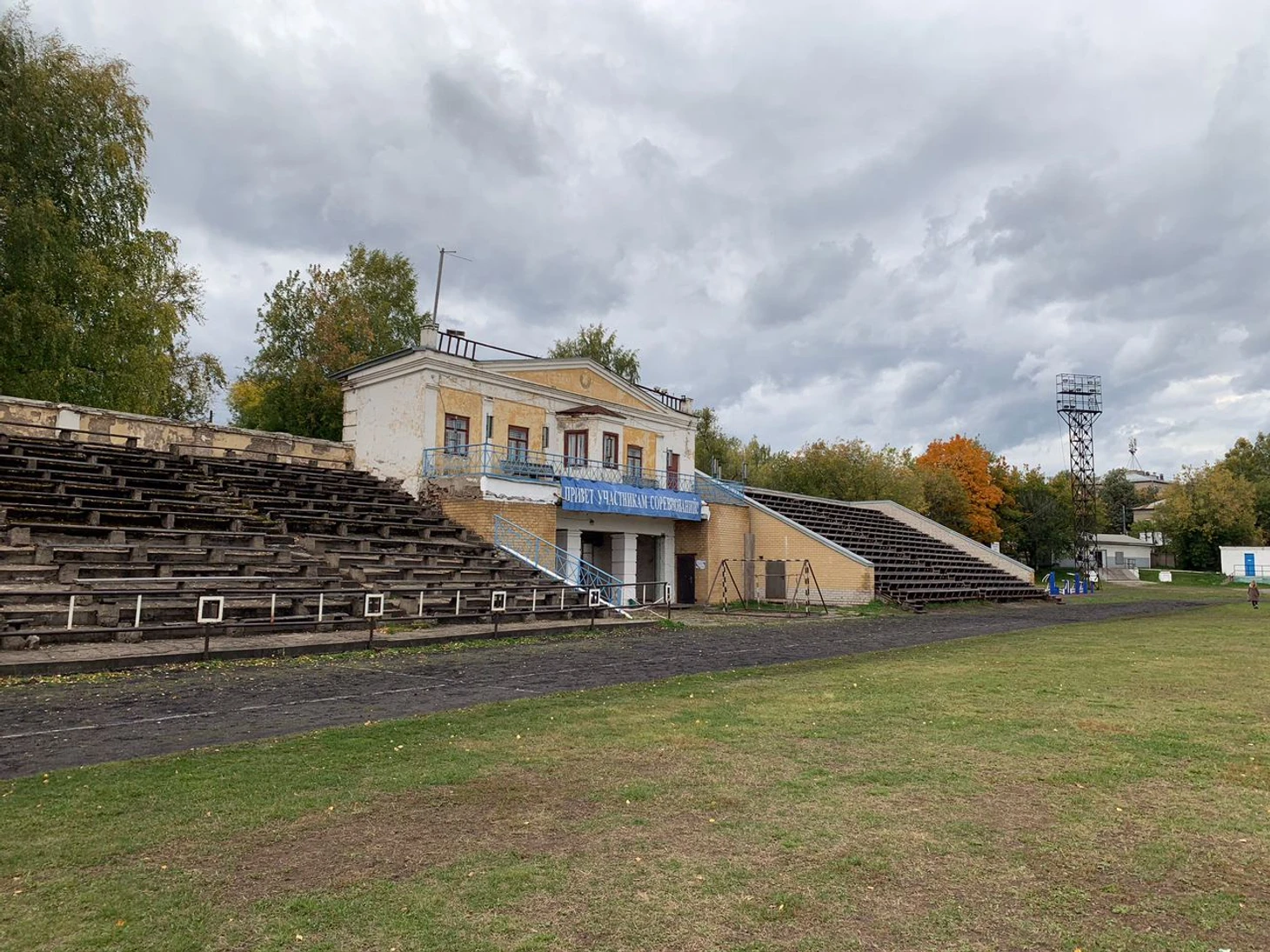 Обратите внимание на отдельностоящие душевые, обнесённые деревянным настилом. Ещё не так давно здесь жил футбол. Сейчас же проводятся соревнования по мотокроссу, из-за которых на забор, разделяющий территорию стадиона и городского некрополя, повесили колючую проволоку, чтобы желающие посмотреть действо и не платить за билет не залезали на ограду.