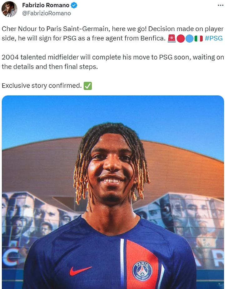 «Шер Ндур в «ПСЖ», поехали! Игрок принял решение, он перейдет из «Бенфики» в «ПСЖ» в качестве свободного агента. Талантливый полузащитник 2004 года рождения скоро завершит свой переход, ждем детали сделки».