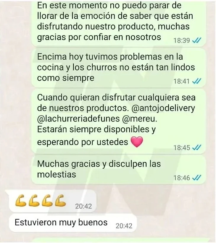 Удивленная София поспешила написать родным Лео извинения за долгую доставку. Девушка призналась, что не может сдержать эмоций. Она попросила прощения за неудобства и сказала, что сегодня чуррос могли получиться не такими вкусными, как обычно. София получила скромный ответ: «Они были очень хороши».