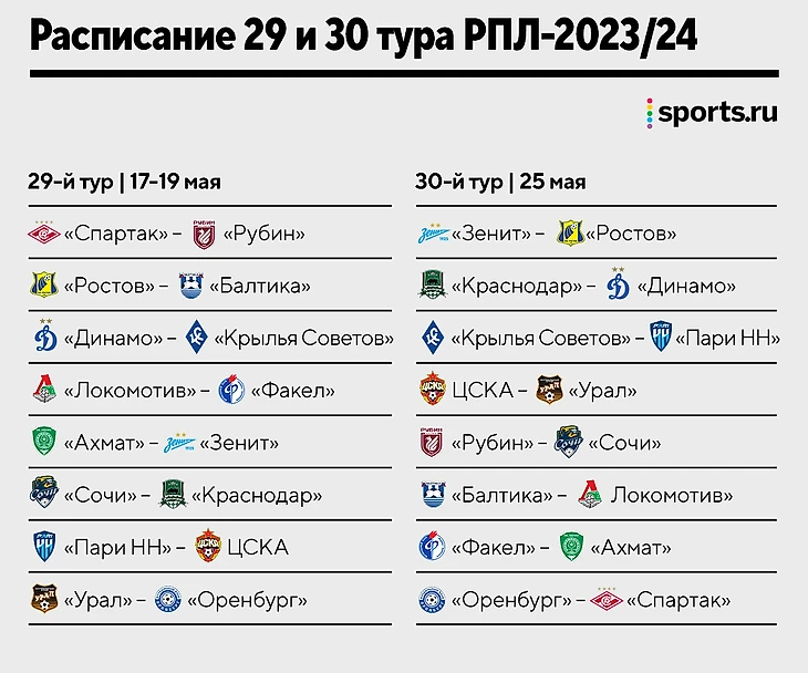 • Наконец, в 28-м туре (10-12 мая) «Зенит» примет ЦСКА, а у «Спартака» запланирован матч против «Краснодара».