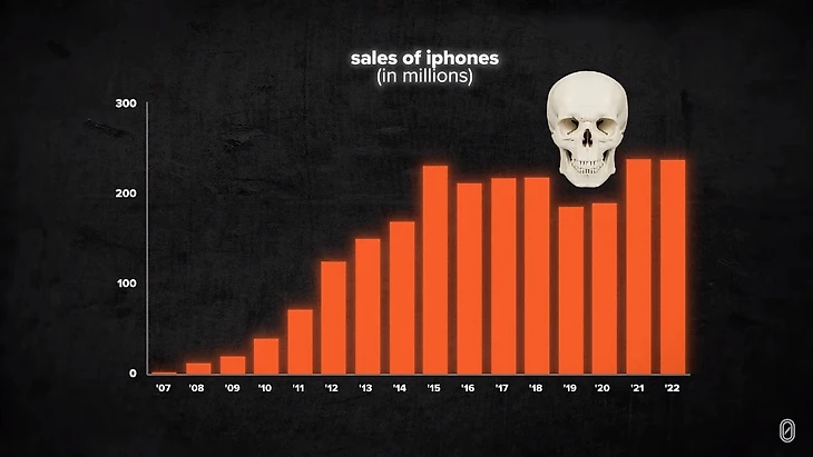 Но не все продукты этой экосистемы одинаковы. Более половины выручки "Apple" приходится на один-единственный продукт: "iPhone"! С одной стороны, впечатляет успех в построении крупнейшей компании всех времен почти полностью на одном продукте. Это также означает, что "Apple" имеет невероятную зависимость от единственного продукта. Что, если однажды люди перестанут покупать "iPhone"? Это именно то, что происходит сейчас. Продажи "iPhone" стагнируют, а при капитализме, если ты не растешь, ты умираешь. Так что у "Apple" серьезные проблемы, но у Тима Кука есть план, большую часть которого составляет спорт.