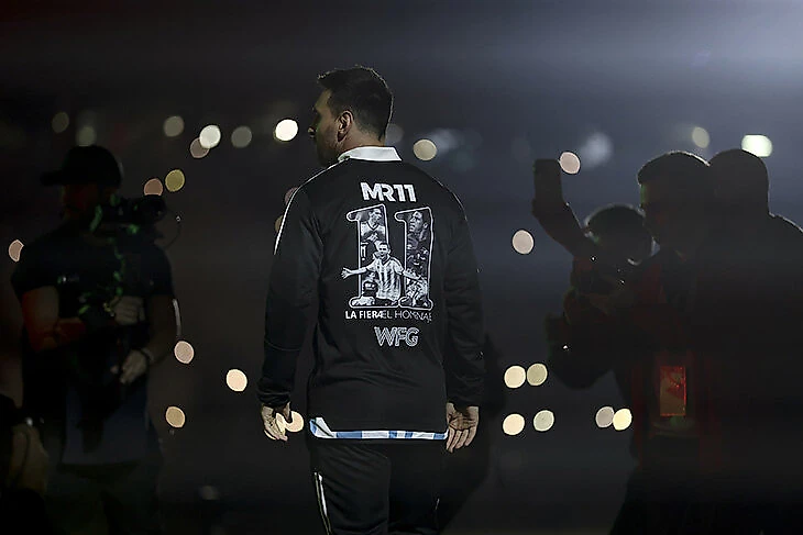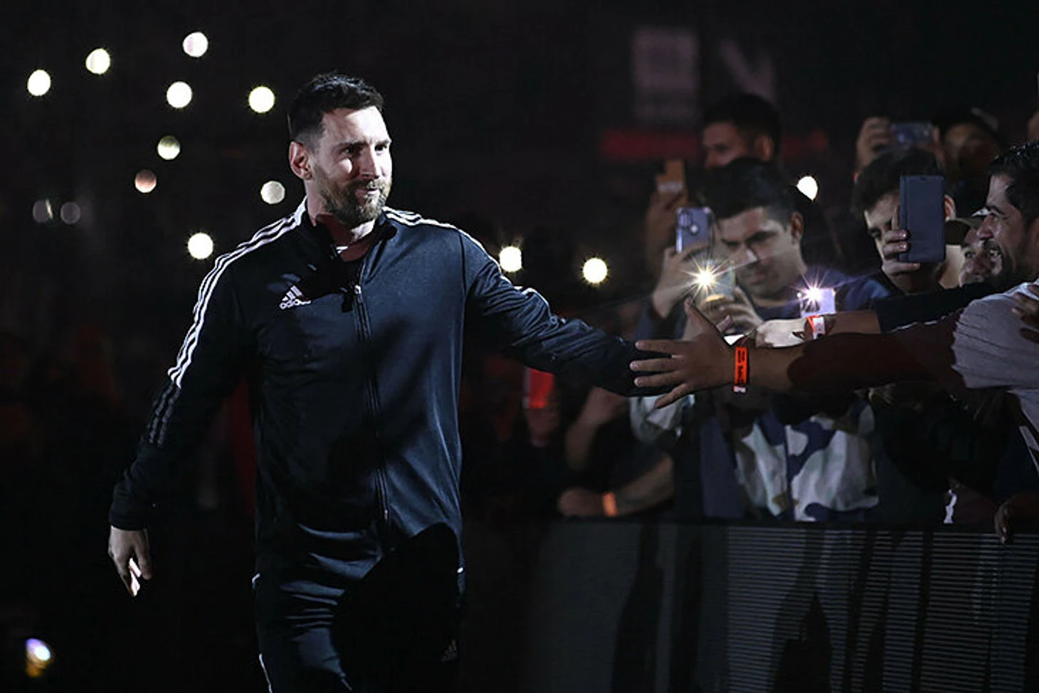 Так уж вышло, что две эти футболки любит и Месси. Перед его приглашением на поле стадион погрузился в полную темноту, зрители зажли фонарики на телефонах.