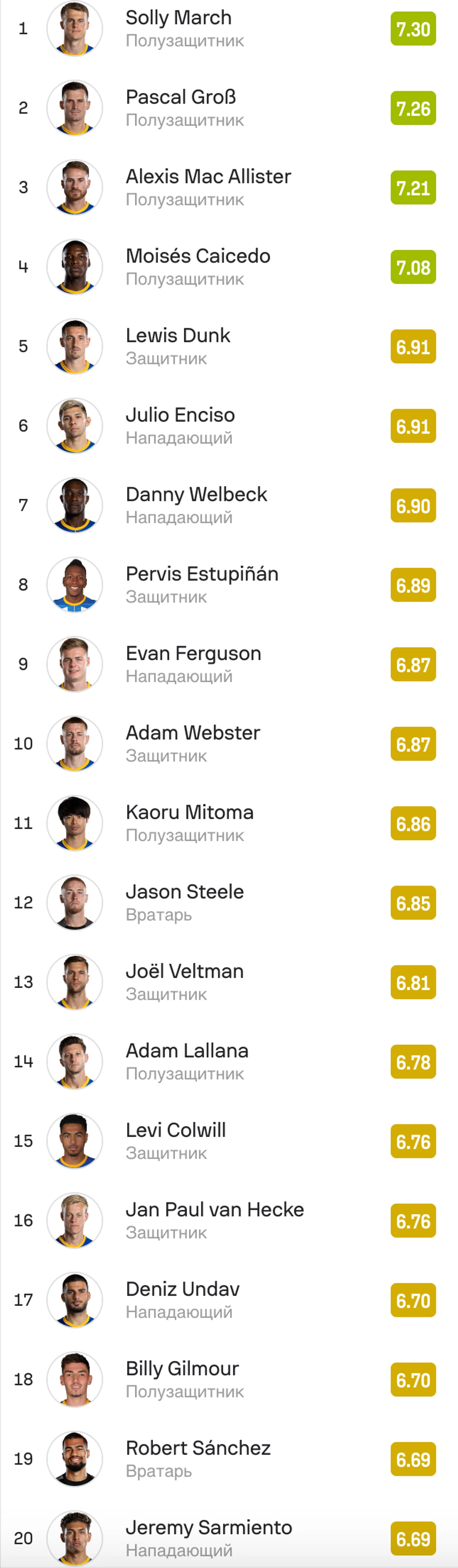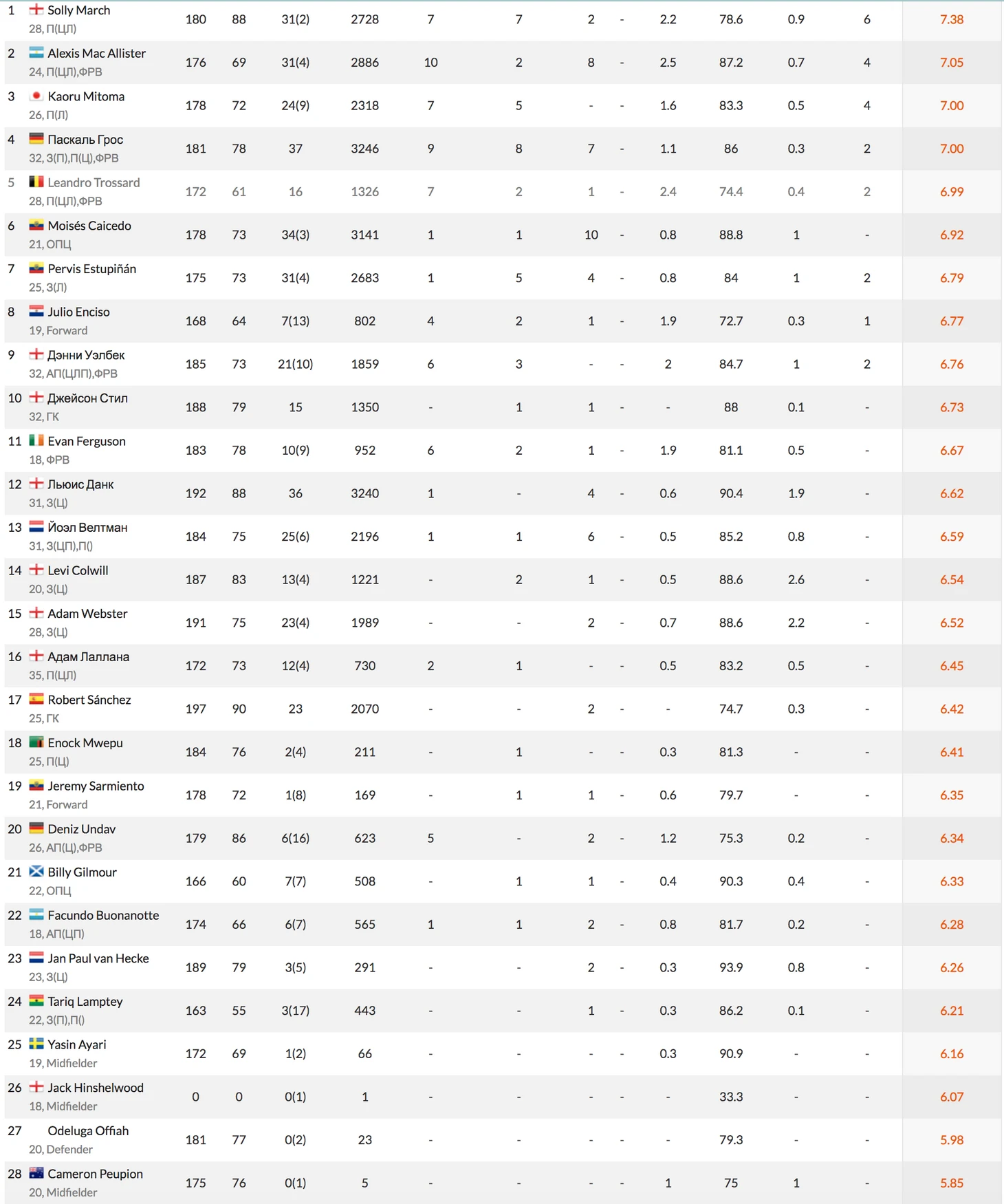 Ну и разумеется, обратимся к оценкам по итогам сезона. Whoscored в топ-5 ставит Солли Марча, Алексиса Мак Аллистера, Каору Митому, Паскаля Гросса и Мойсеса Кайседо (если не считать ушедшего посреди сезона Троссарда). Очень логичная пятерка, с которой сложно поспорить. Ну а места внутри неё — дело вкуса. Также портал достаточно высоко котирует перформанс Хулио Энсисо, но при этом гораздо ниже оценивает игру Факундо Буонанотте, с чем я не очень согласен. Аргентинец должен находиться повыше. Как и Дениз Ундав и Адам Лаллана.
